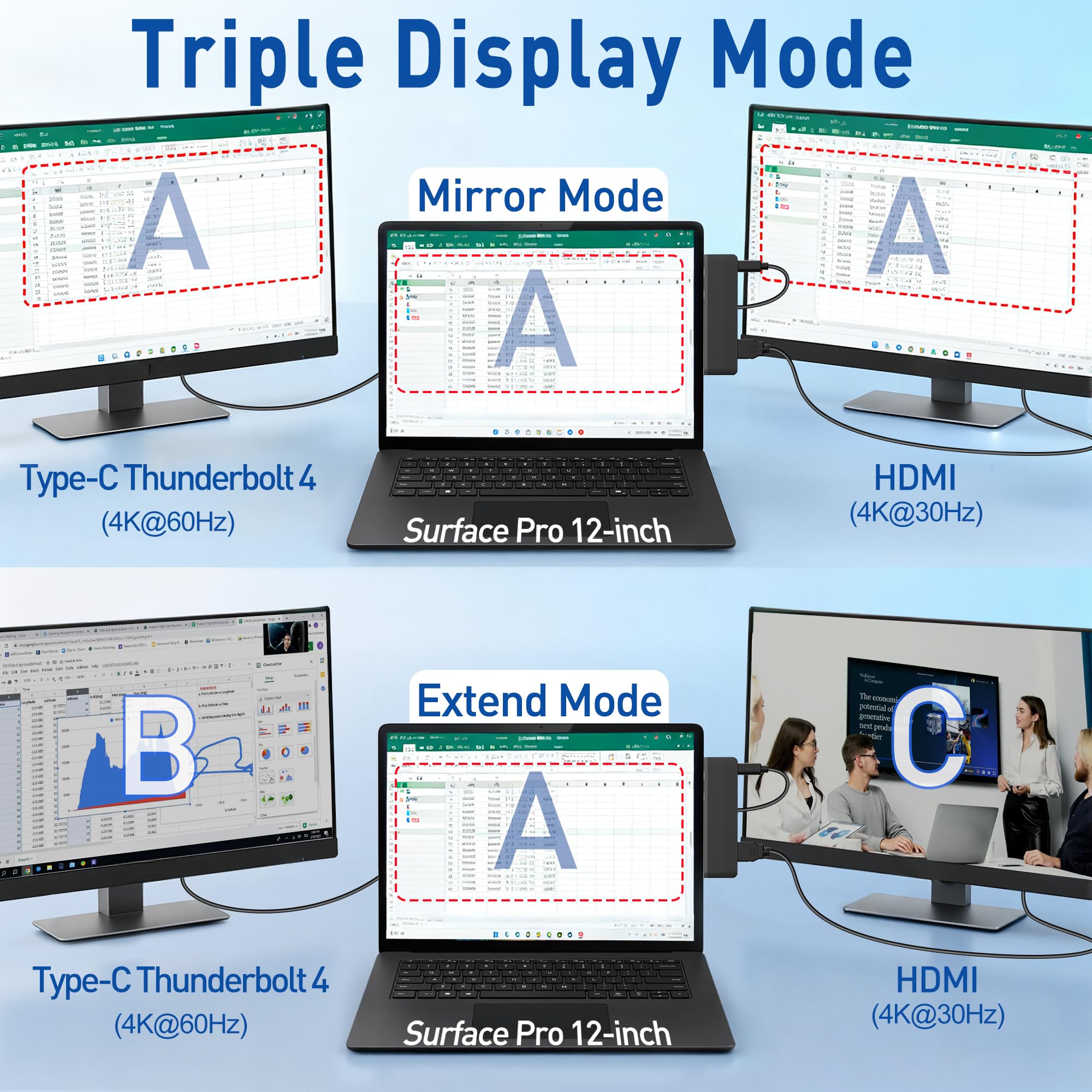 Crystal-Clear 4K Triple Display Productivity:This Surface Pro 12 hub enables you to connect two external monitors (via 4K@30Hz HDMI and 4K@60Hz Thunerbolt 4) while keeping your Surface Pro 12’s built-in display active—effectively tripling your screen real estate. Perfect for multitaskers, designers, programmers, and content creators who require extended visual workspace. Choose between extended or mirrored mode with stunning UHD clarity on each output. Maximize your workflow with effortless triple-screen expansion!