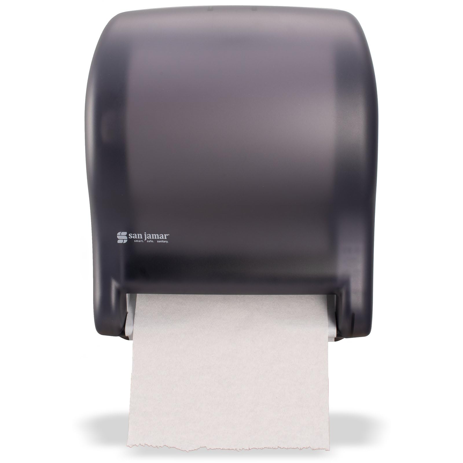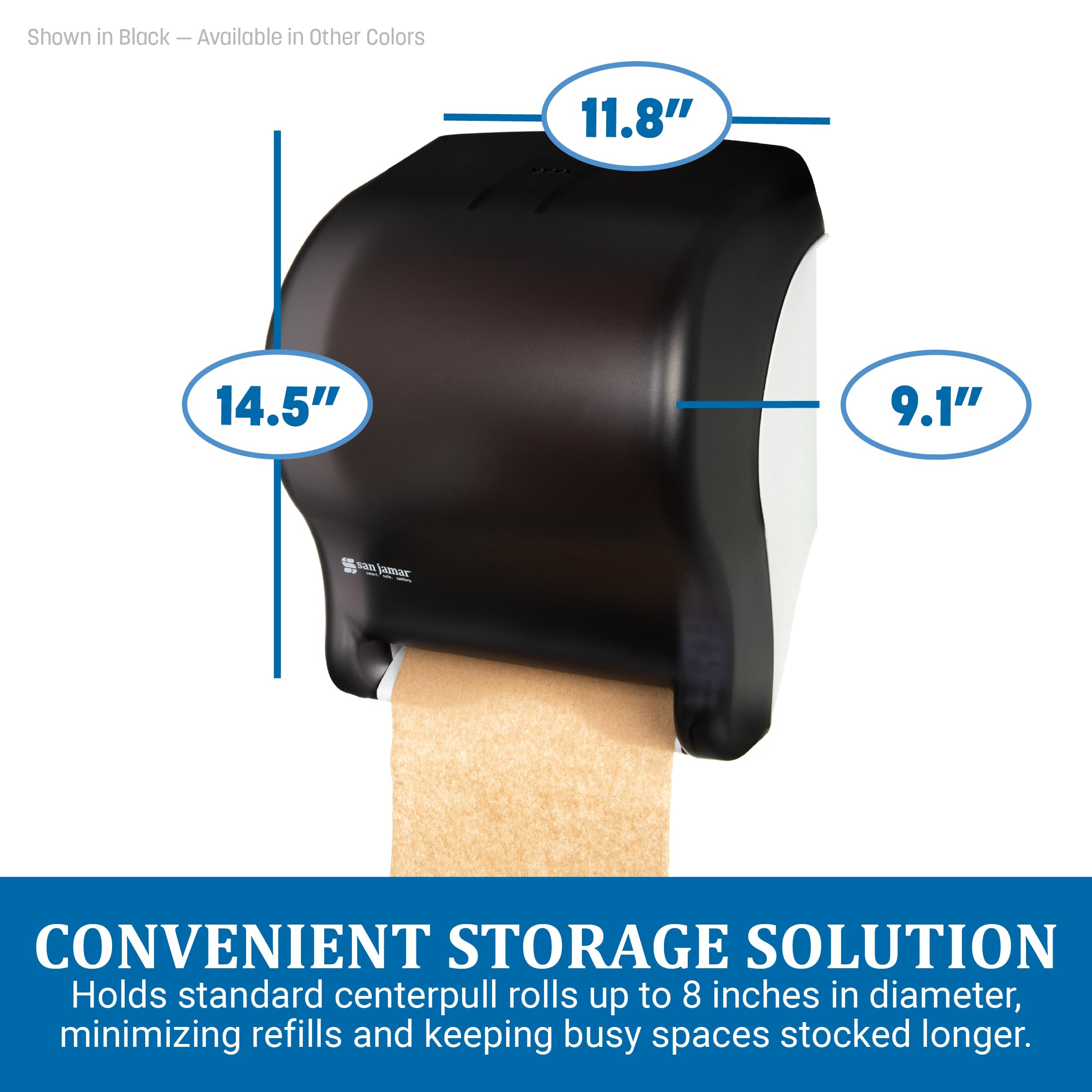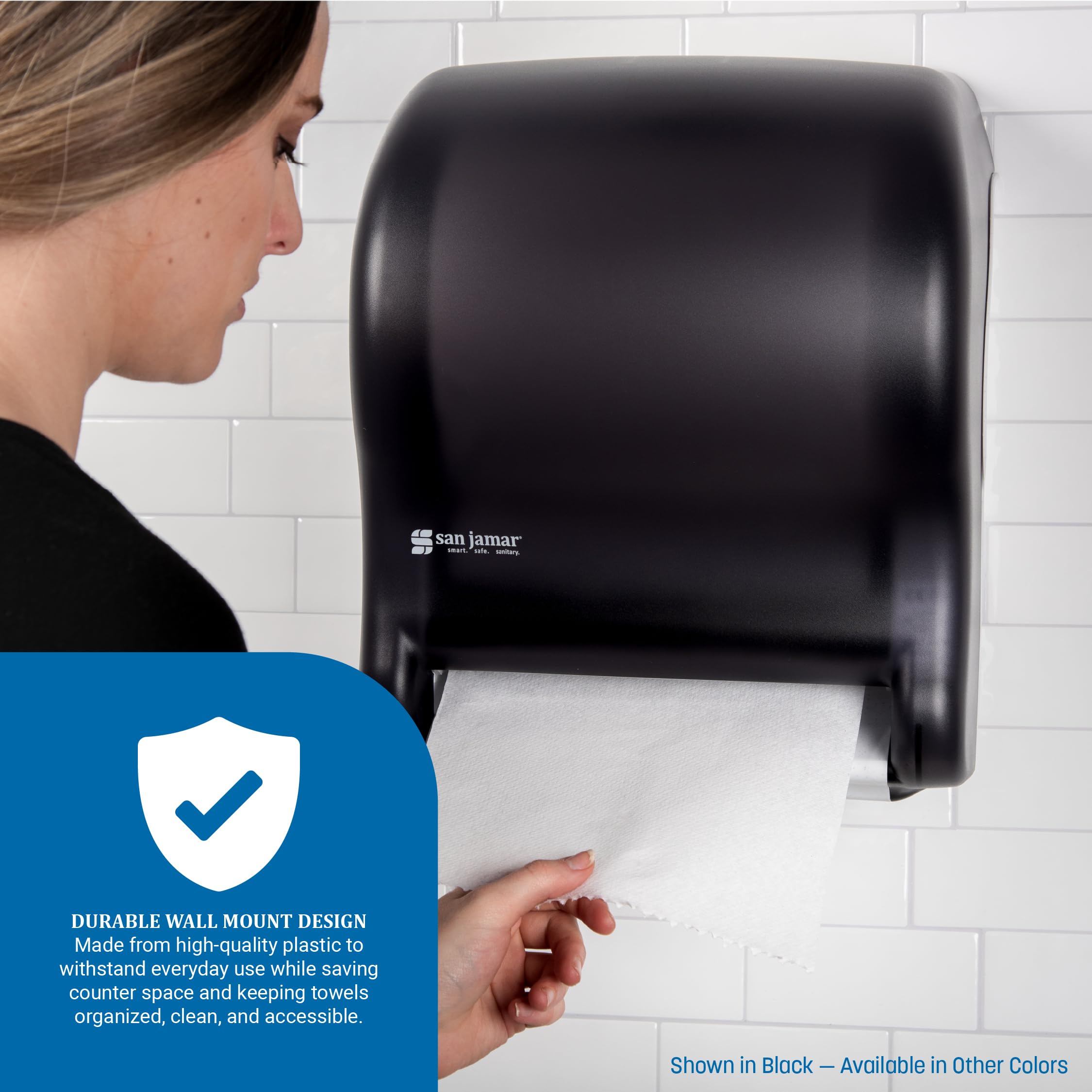 The San Jamar Classic Tear-N-Dry Paper Towel Dispenser is your ultimate solution for efficient paper towel dispensing in bathrooms, kitchens, and restaurants. Experience consistent delivery of 10” standard paper portions for all roll qualities, ensuring a seamless workflow without any waiting time, keeping your operations running smoothly. Crafted with transparent plastic, the dispenser's cover is both durable and theft-proof, allowing users to effortlessly monitor the roll status at a glance, providing peace of mind and convenience. Its compact construction is tailor-made for tight-fitting spaces, effectively reducing transportation costs while maximizing efficiency, making it an ideal choice for various environments where space is a premium. With easy mounting capabilities, this dispenser effortlessly attaches to most wall surfaces, offering convenient access to towels whenever needed, promoting ease of use and accessibility in any setting. Operating on just (4) D Cell batteries, this dispenser requires minimal maintenance, ensuring long-term functionality and reliability without the hassle of frequent battery replacements, providing added convenience for busy establishments.