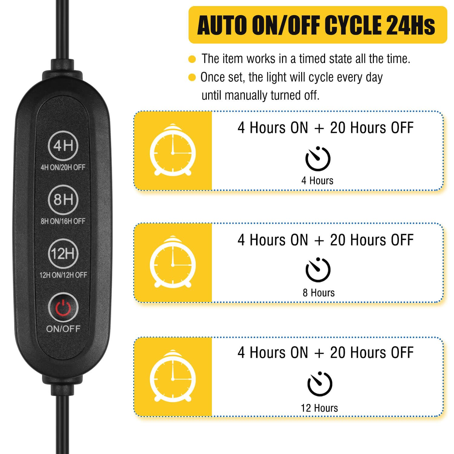 【CYCLE AUTO ON/OFF TIMER】The grow light works in a timed state all the time, The timer function of the growth light allows for 4/8/12 Hours timing for plant needs. and it works in a timed state all the time. Once being set up, the grow light will automatically turn off after set hours, and then the plant growth lights turn on and off at the same time on the next day for a 24-hour cycle, copy daily turn on and off times.
