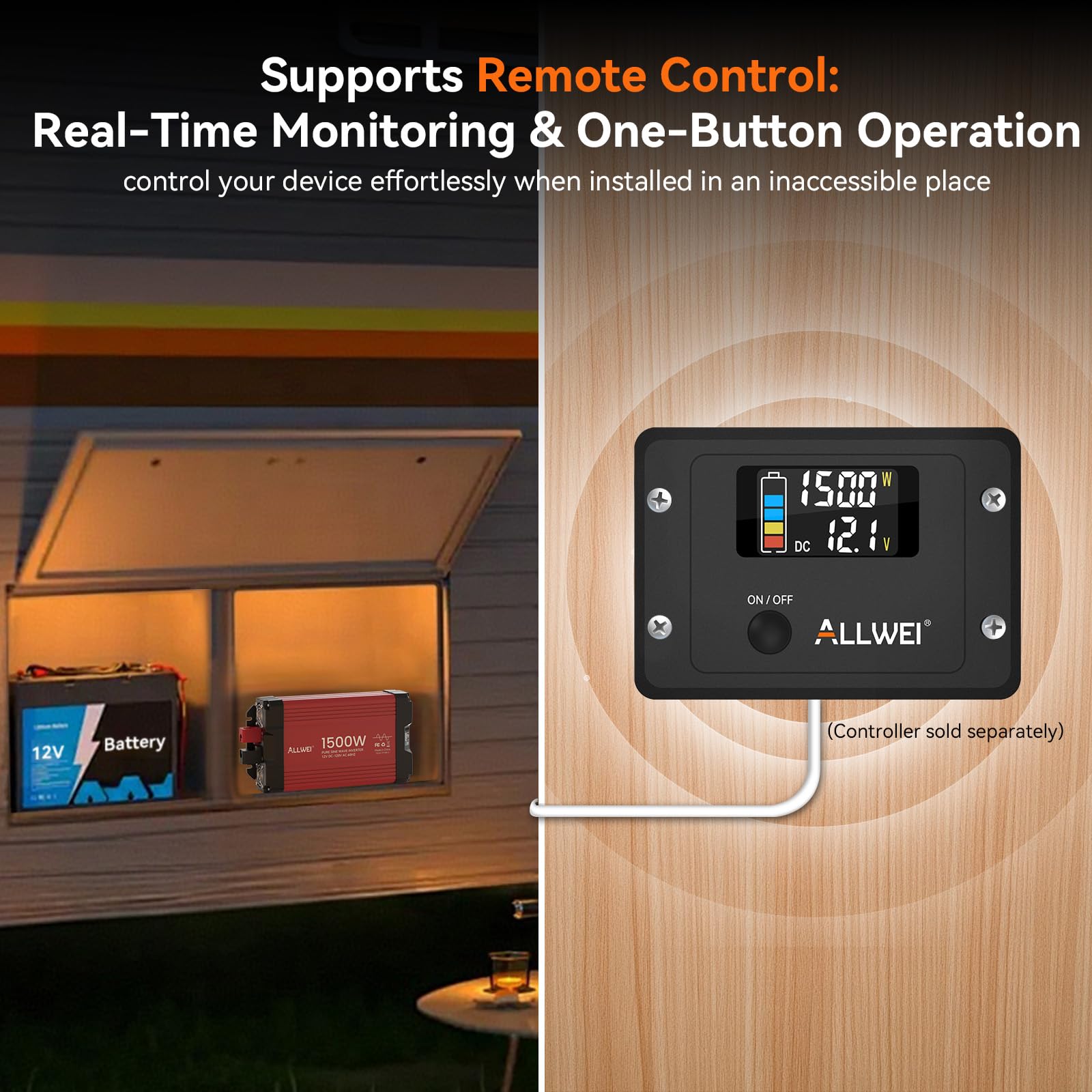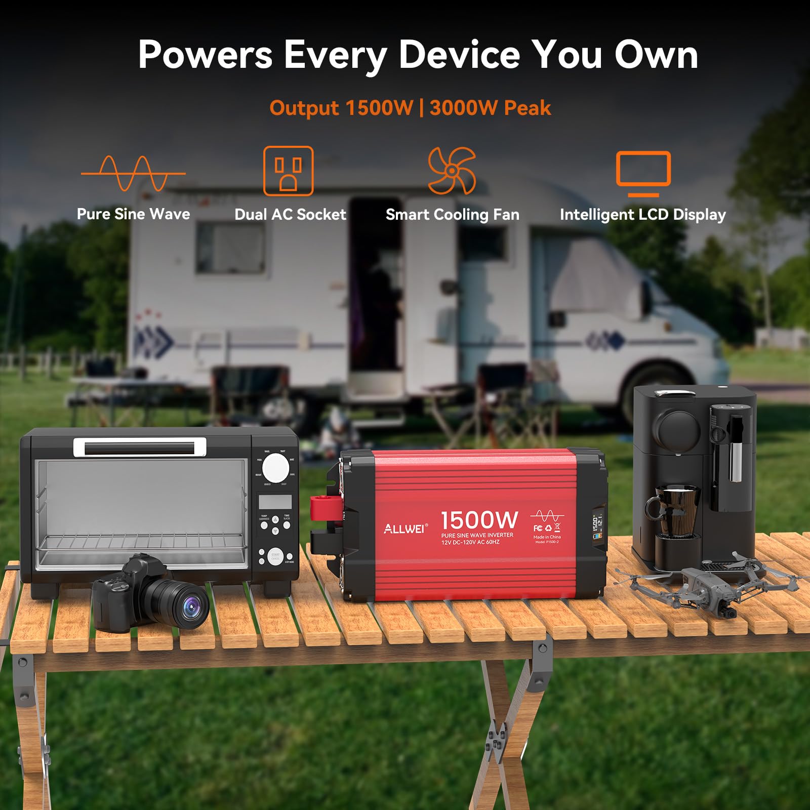 【Powerful DC-AC Converter - Effortless Start】: ALLWEI 1500 watt inverter delivers continuous DC 12V to 110V/120V AC power, 3000W peak surge during load start-up, for heavy loads like window air conditioners, microwaves, or pool pumps—no more startup power struggles. Pure sine wave with maximum conversion efficiency >90%, this power inverter 12v to 120v minimizes conversion loss while powering RVs, truck, off grid electrical appliance