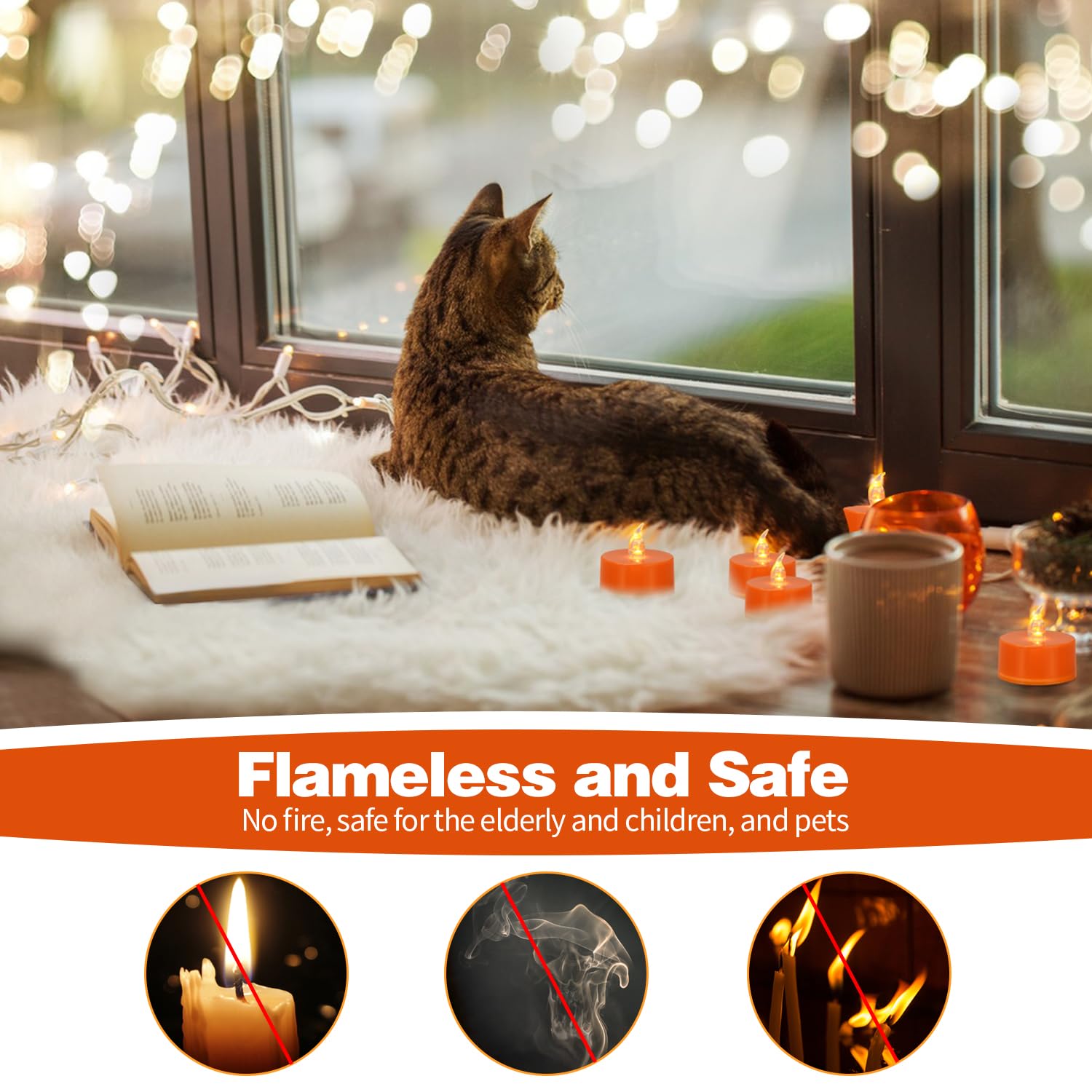 【Flameless and Safe】- No heat, no flame, LED tea lights can be safely placed on the bed, carpet and anywhere you want without causing fire.