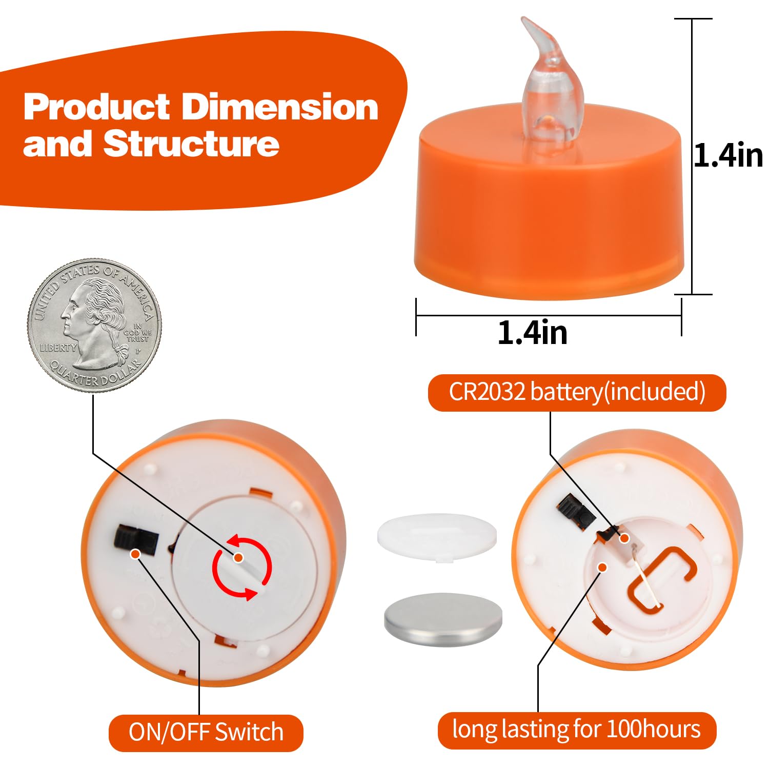 Specifications: Item name: Flameless tea lights Material: PP Tea light size: 1.4 x 1.4 x 1.4in Tea light weight: 0.3oz/piece Light color: Warm yellow Light effect: Non-flickering Switch mode: Manual switch Battery: 1pcs CR2032 per light(included) Working time: 100H+ Package List: 12 × Flameless tea lights(warmyellow light, orange base)