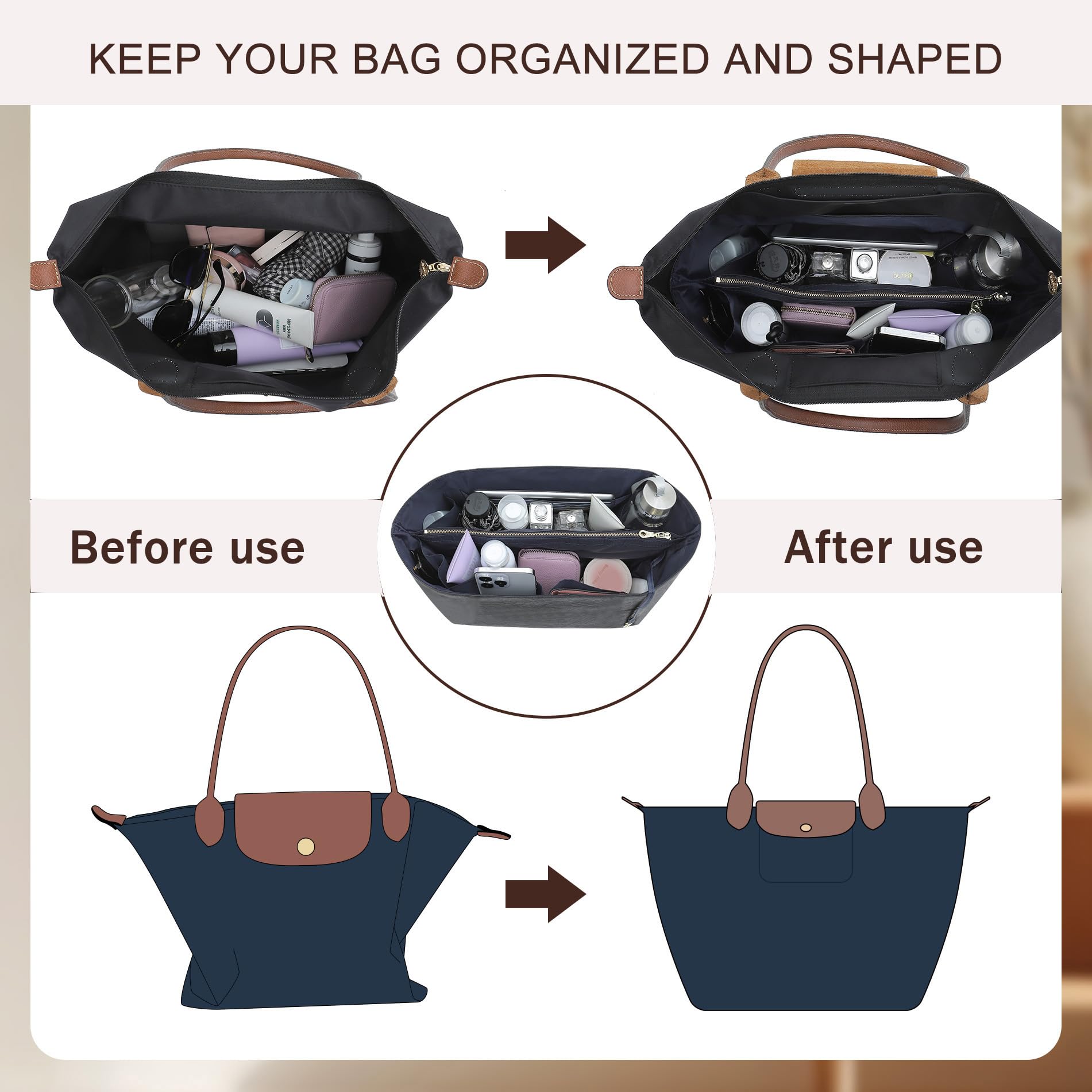 2025 UPGRADED MATERIAL: This le pliage large organizer is made of newly upgraded premium DuPontPaper material, not only le pliage insert are ultra-lightweight, waterproof and easy to clean but also provides a sturdy, non-deforming structure that no pilling and support foldable. So this long champ organizer insert is easy to insert and remove from the handbag, does not add to weight to your bags