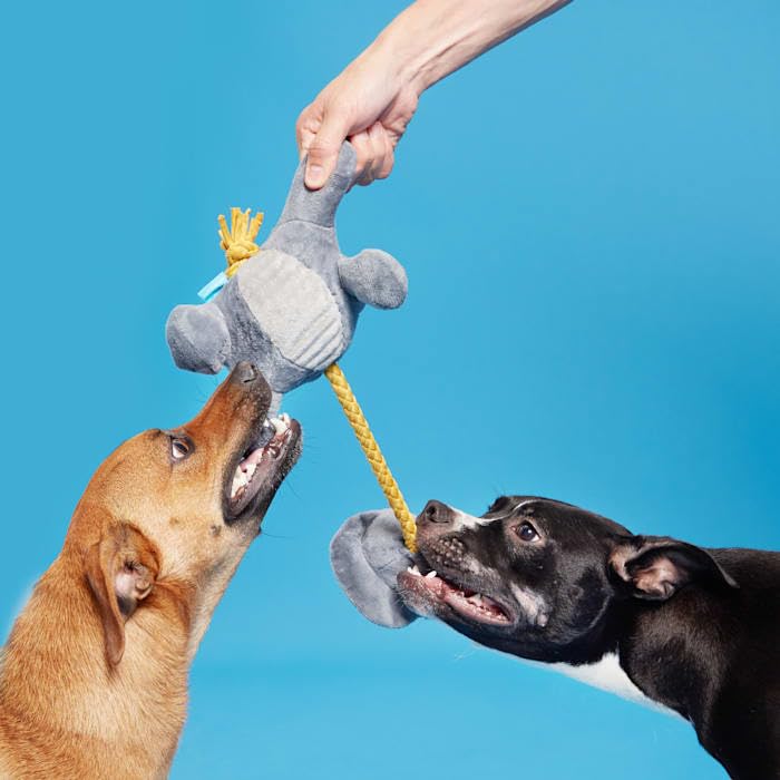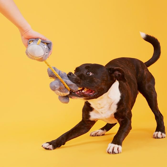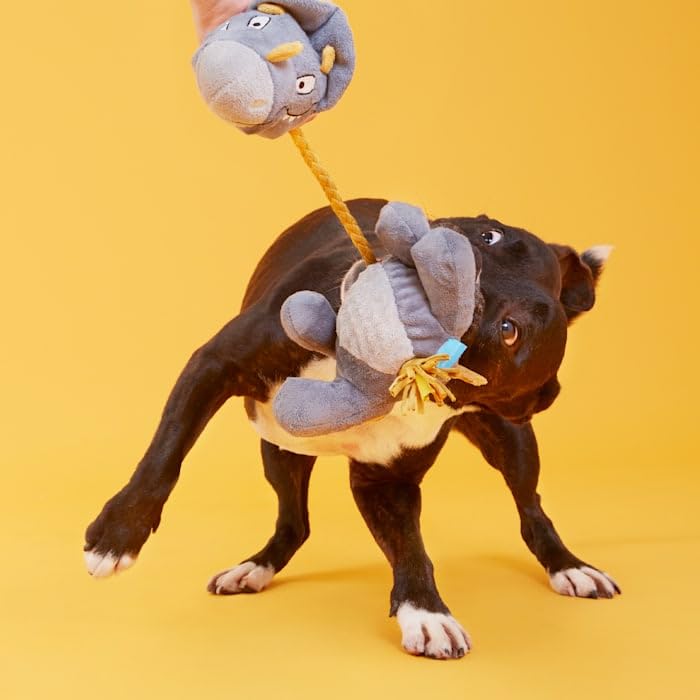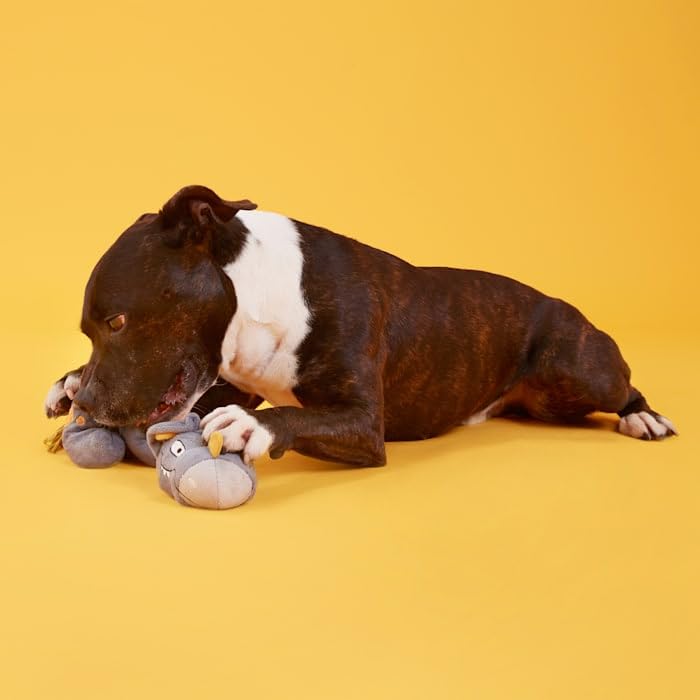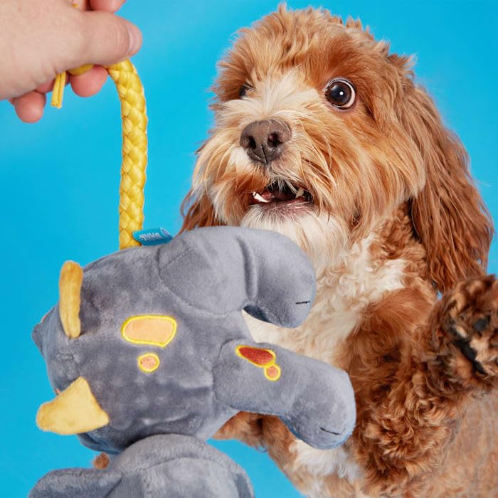 This triceratops dog toy is your pup's new favorite prehistoric plaything. Herbert the Herbivore might look peaceful, but this vegetarian's ready to rumble. Made with a pull-through T-shirt rope that's great for tug-o-war. And just when you think he's going extinct, Herbie reveals a spiky, squeaker ball bonus toy hidden inside his chewrassic body!