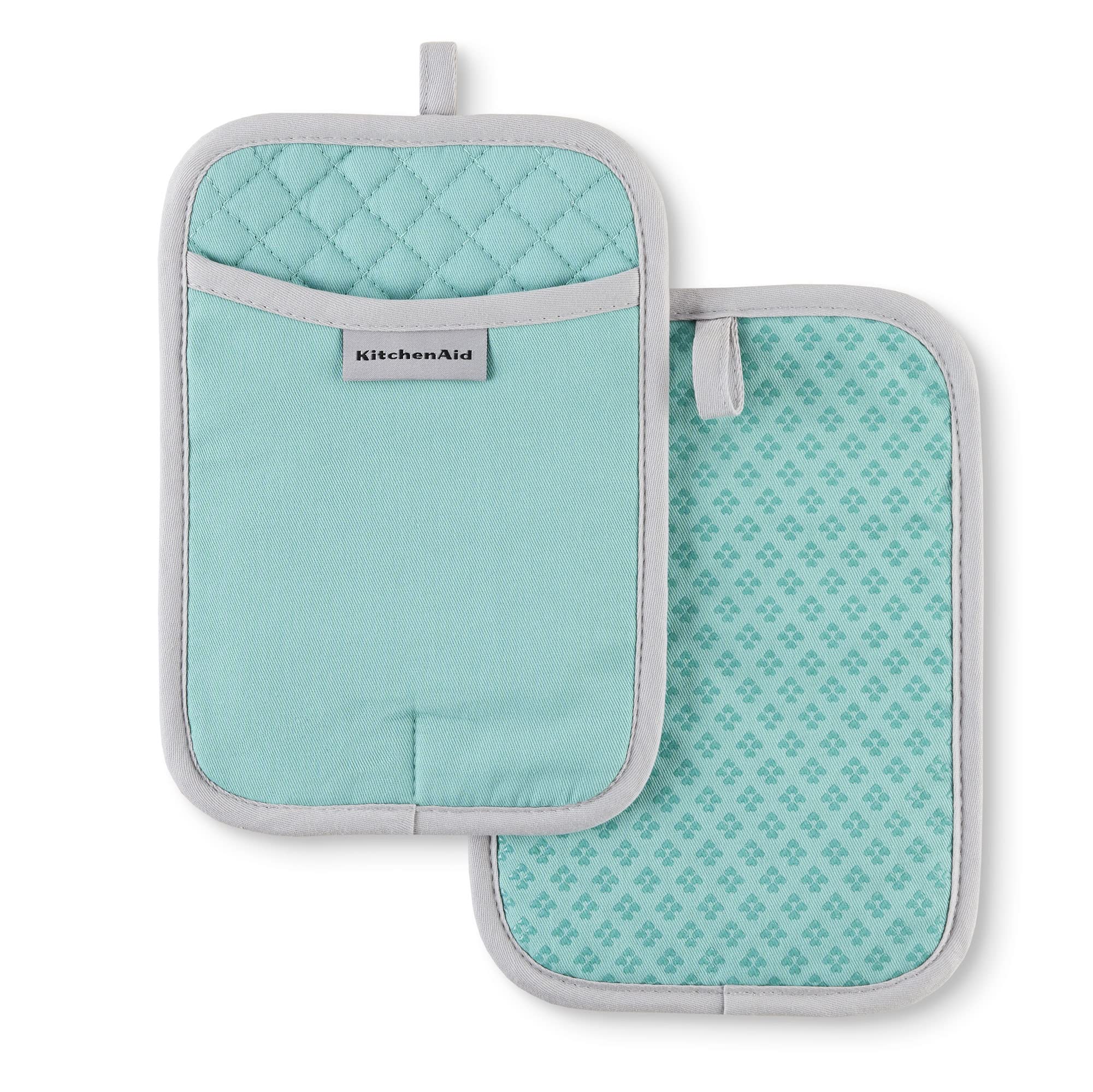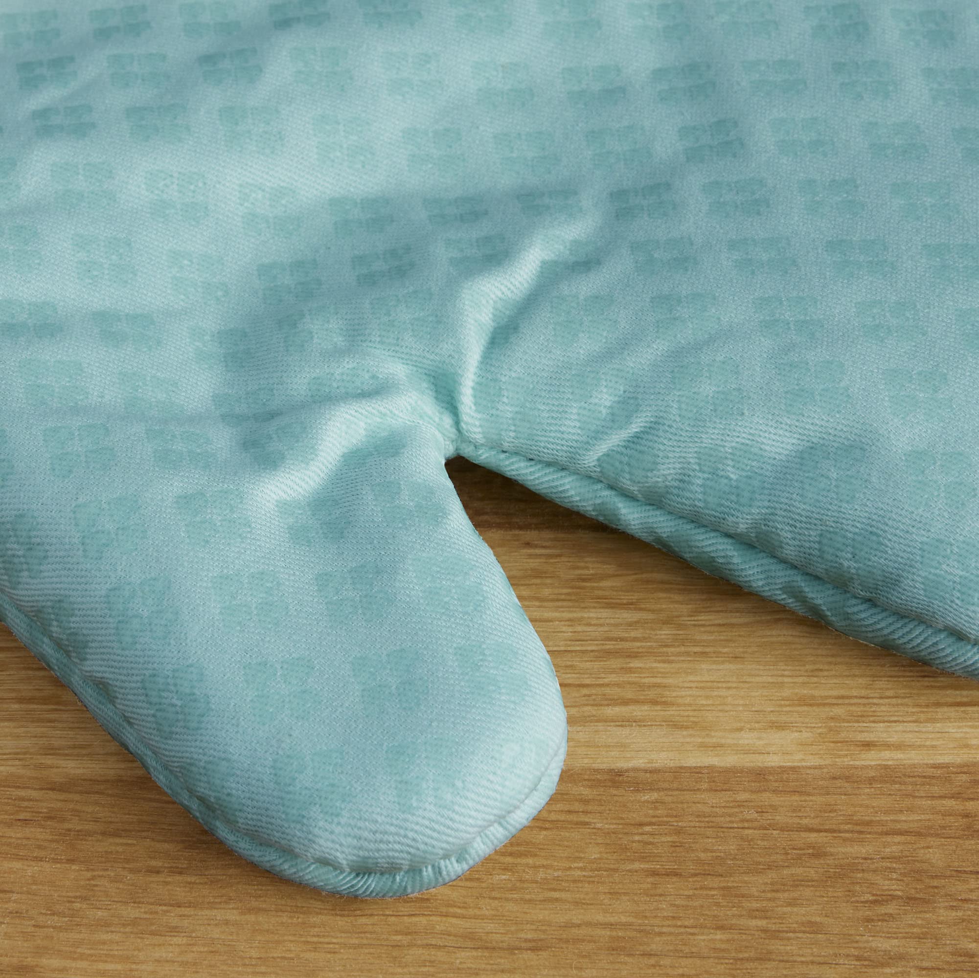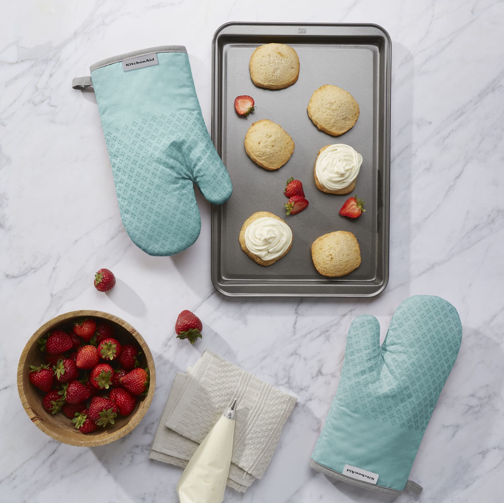Shield your hands from the heat with the Kitchen Aid Asteroid Oven Mitt 2 Pack. These oven mitts each measure 7 inches wide by 12. 5 inches long for a spacious fit, and they are heat resistant to protect your hands while handling hot pots, pans, and dishes. The heavy-duty, 100 percent cotton fabric on the outside as well as the cotton lining offers comfort, flexibility, and insulation. Textured, silicone print grips on the mitts are heat resistant and also ensure a more firm and secure grip when handling dishes and cookware. The matching oven mitts feature a convenient hanging loop to easily display or store them when not in use. They are easy to clean and machine washable for easy care. Use your Kitchen Aid Asteroid Oven Mitt 2 Pack along with coordinating kitchen accessories from Kitchen Aid including potholders and kitchen towels for a complete set of Kitchen Aid kitchen essentials! Each item is sold separately. Perfect for cooking and baking. Give the Kitchen Aid Asteroid Oven Mitts as a gift to a friend or family housewarming, on holidays or any special occasion. Made in China.