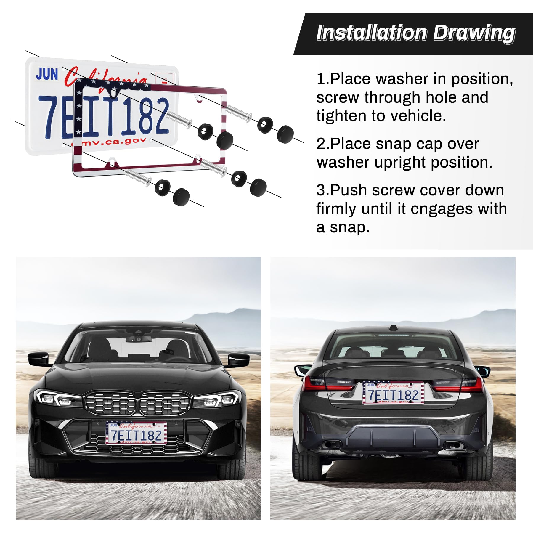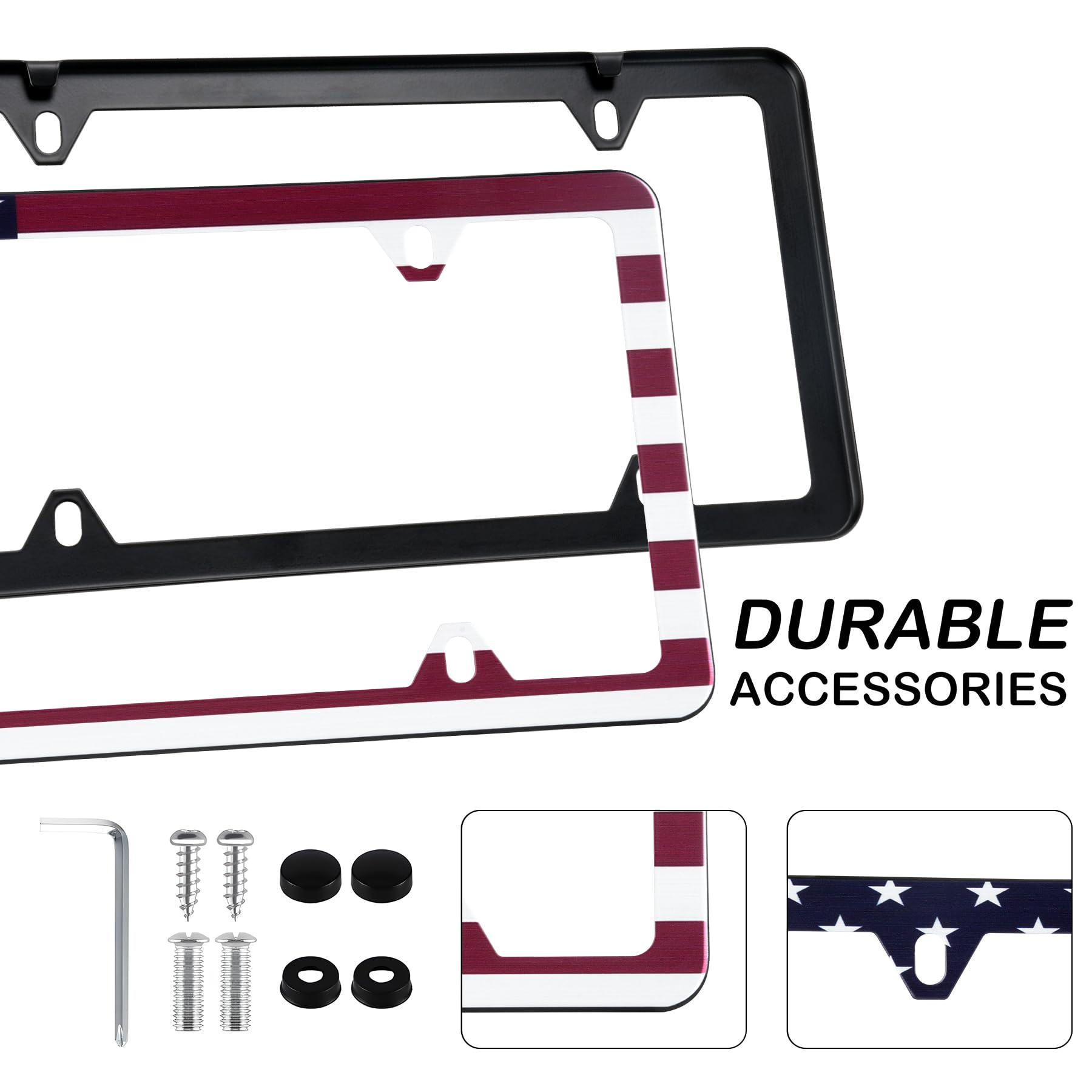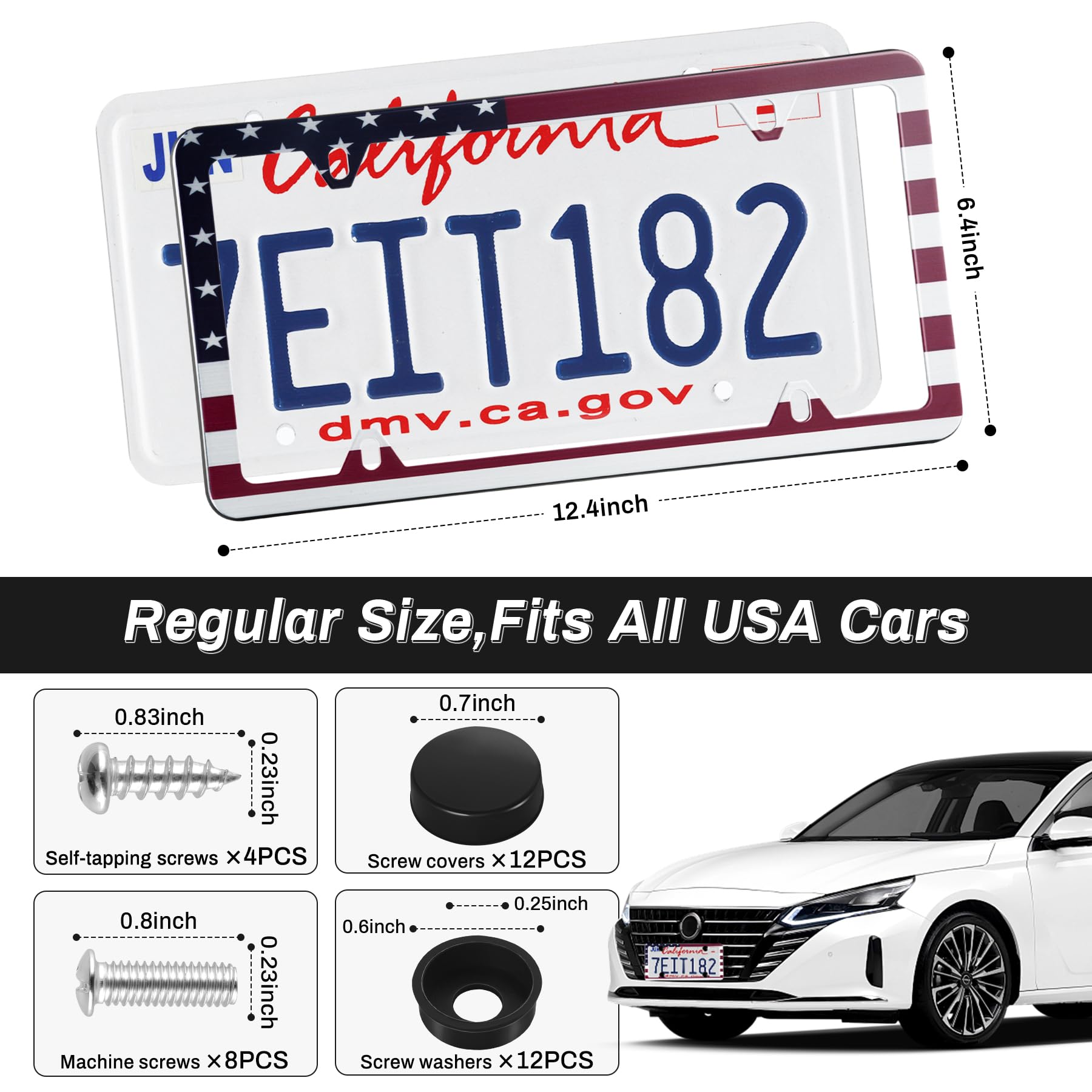 【Package Contents】:2 pcs License plate frames, with 12 Screw Caps (plastic), 12 Machine Screws, 12 Washers (plastic), 4 Self-tapping Screws, 1 Screwdriver.
