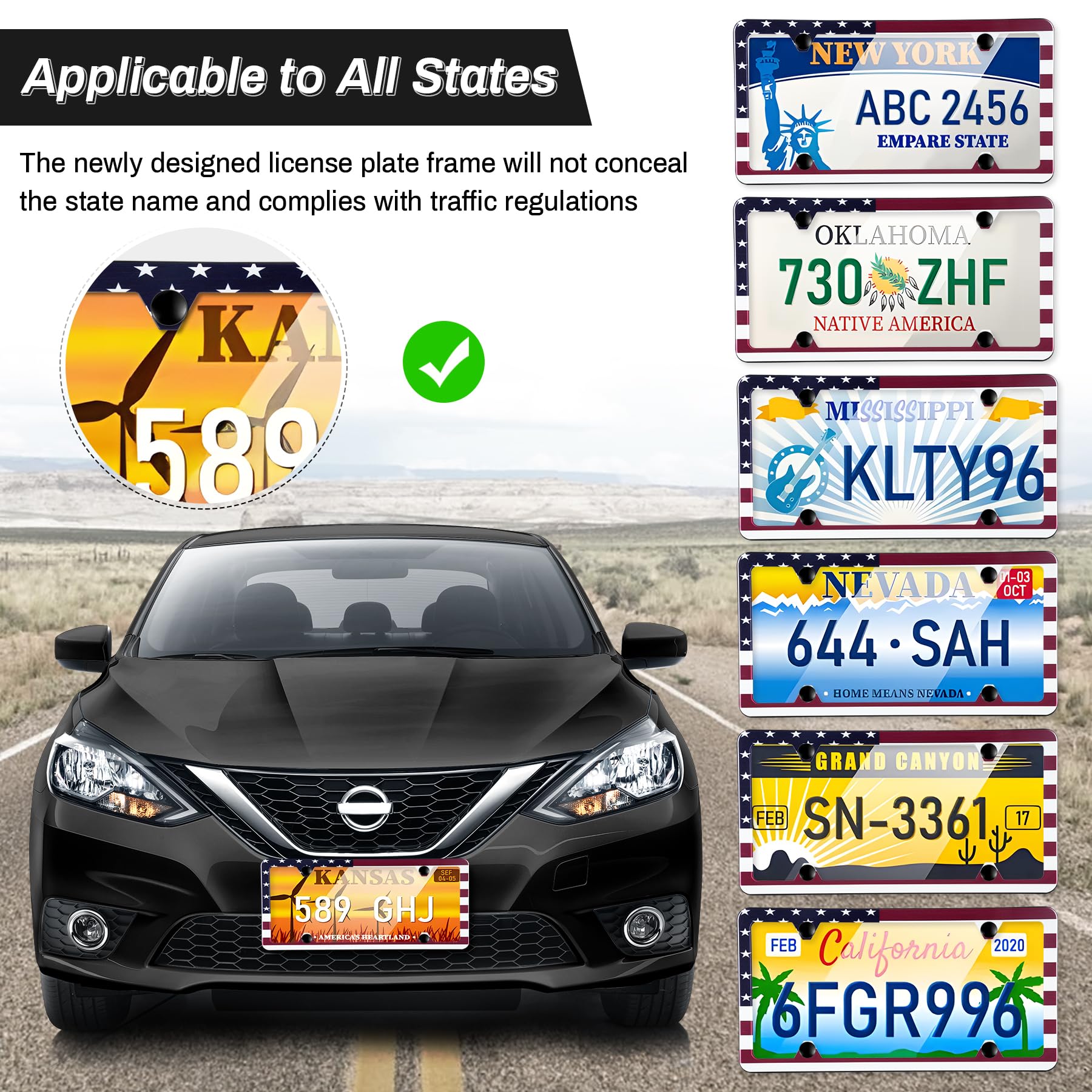 【Size and Special Design】:These 4 Hole License Plate Frames measure 12.3" x 6.3" . Internal dimensions:11.4" x 5.3” - perfect fit for American State car license plates. Slim plate frame design.