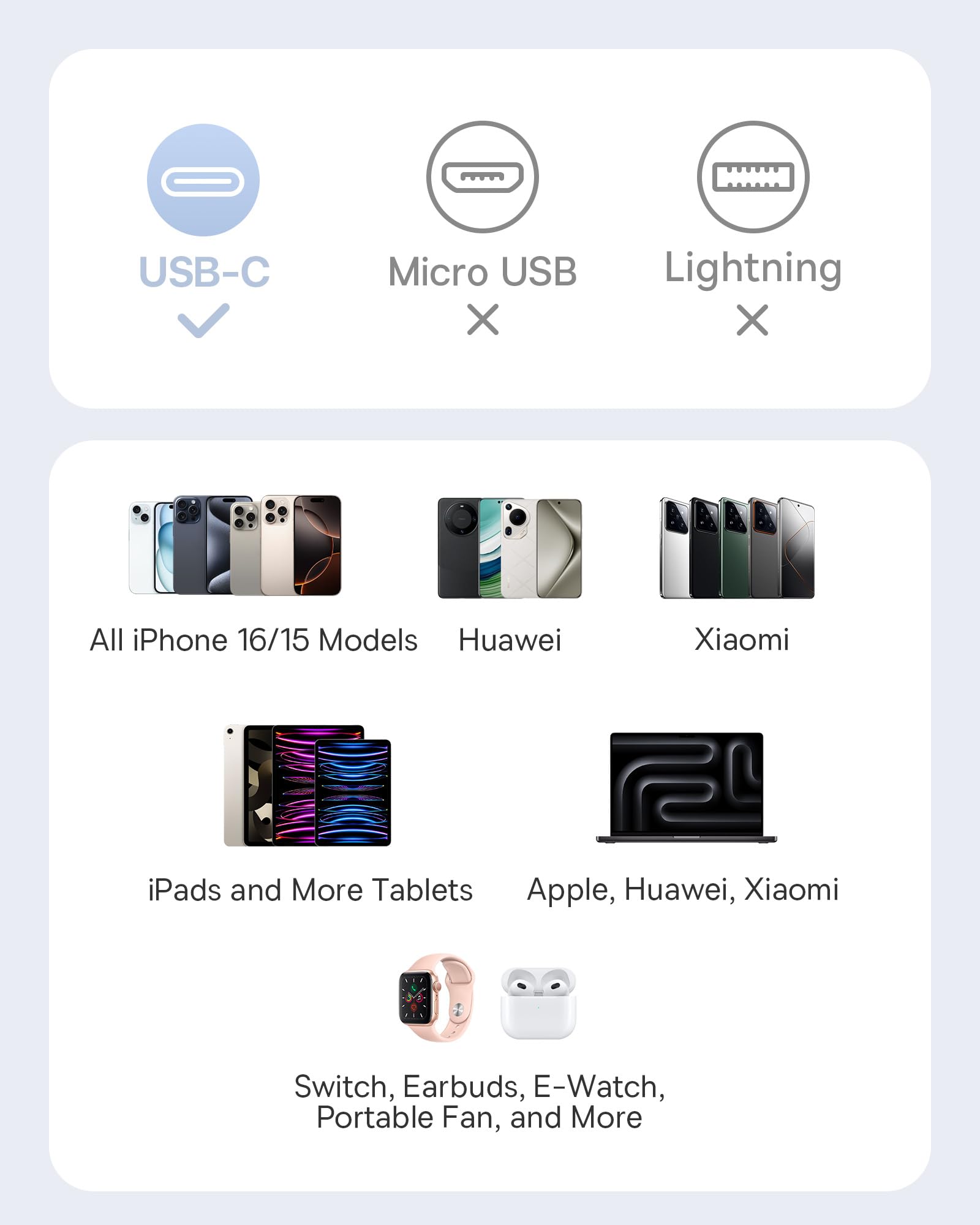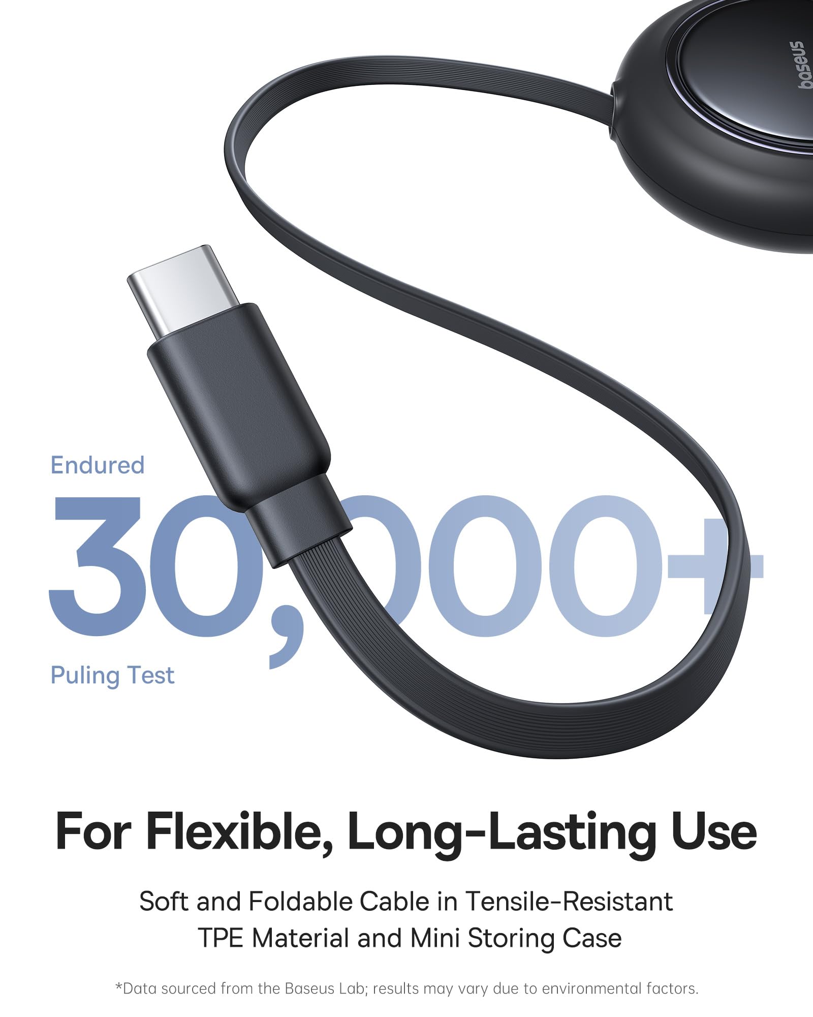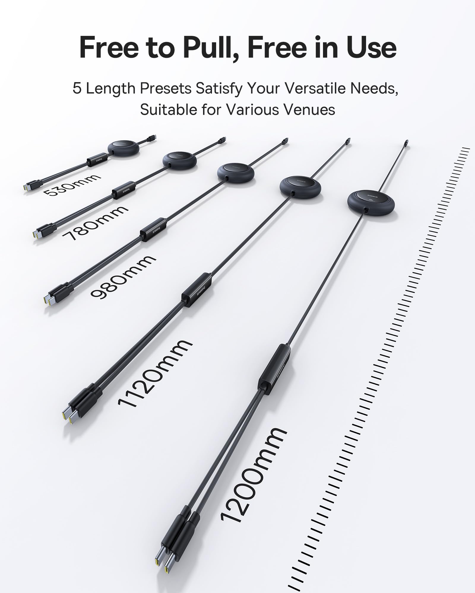 Adjustable Length: The retractable USB-C cable features 5 length presets for versatile needs. Whether you use it in the car, at your desktop, or on your nightstand, just pull the cable to your desired length to charge without causing cable messes.