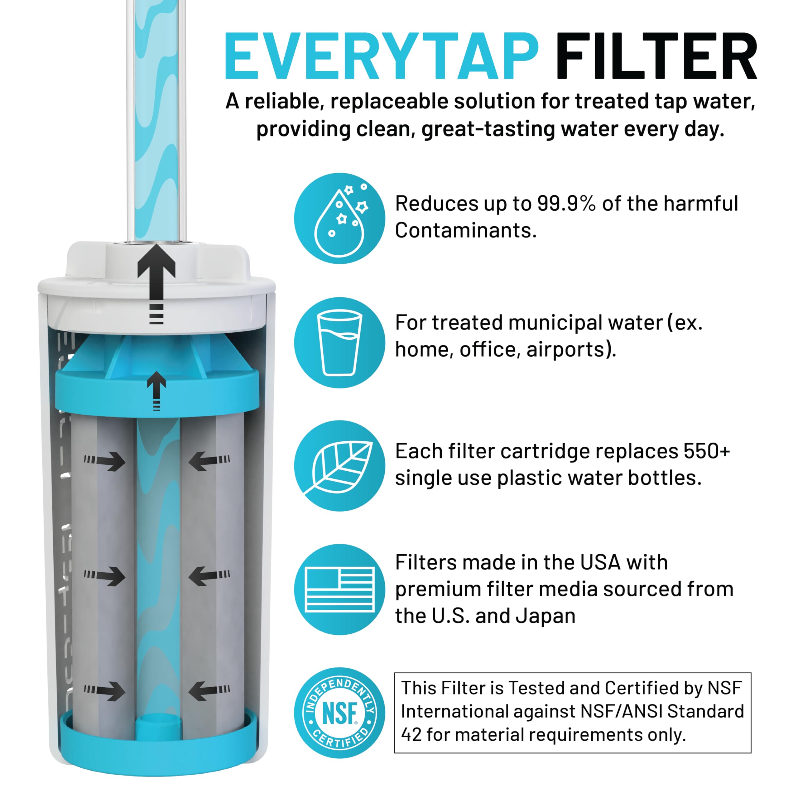 EveryTap Filter (Blue) – Tap Water’s Best Friend: Reduces 70+ common tap water contaminants, including chlorine, heavy metals, and PFAS. Enjoy fresh, great-tasting water with every sip, without the unpleasant aftertastes. Perfect for your daily indoor hydration routine!
