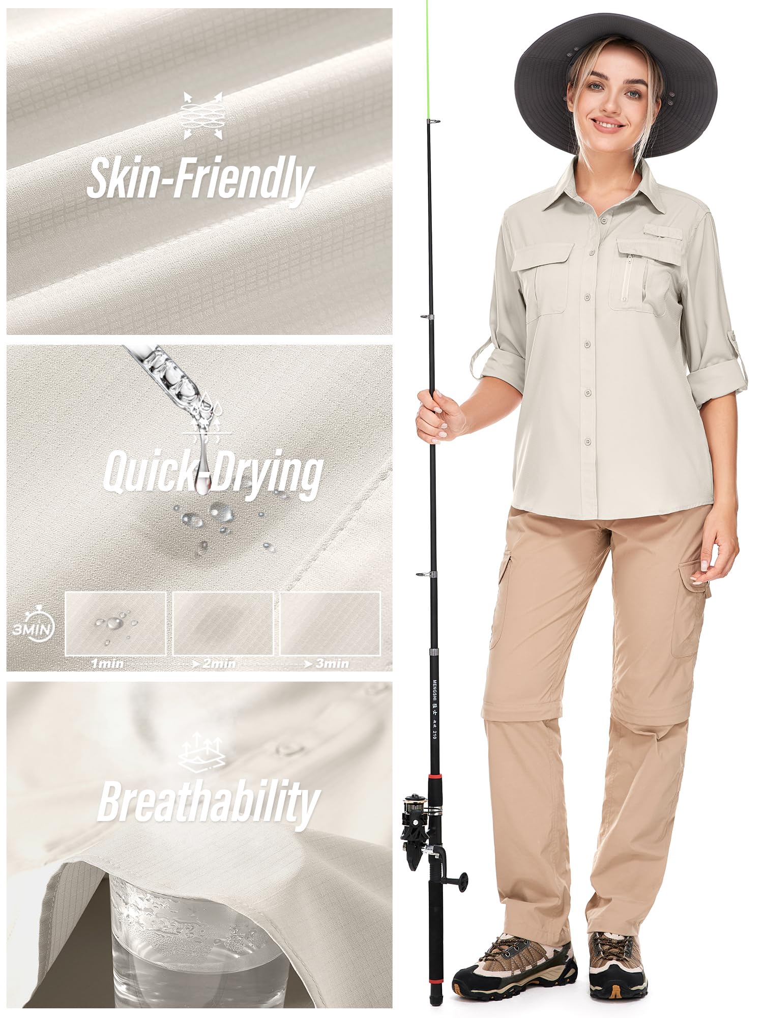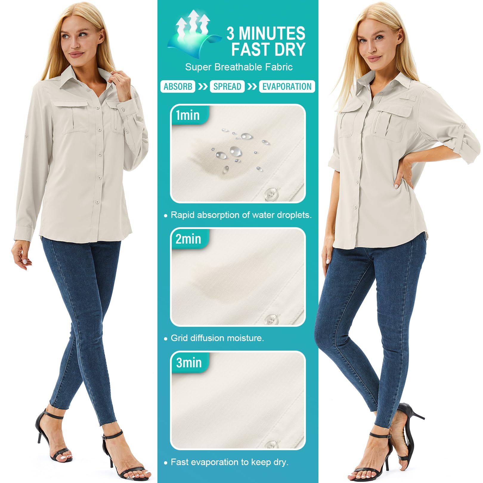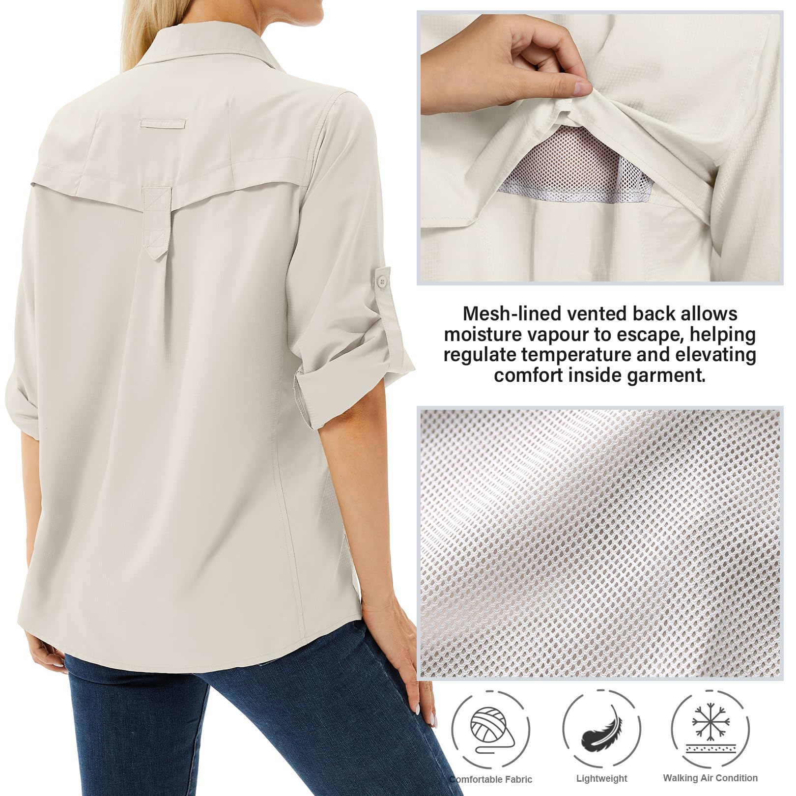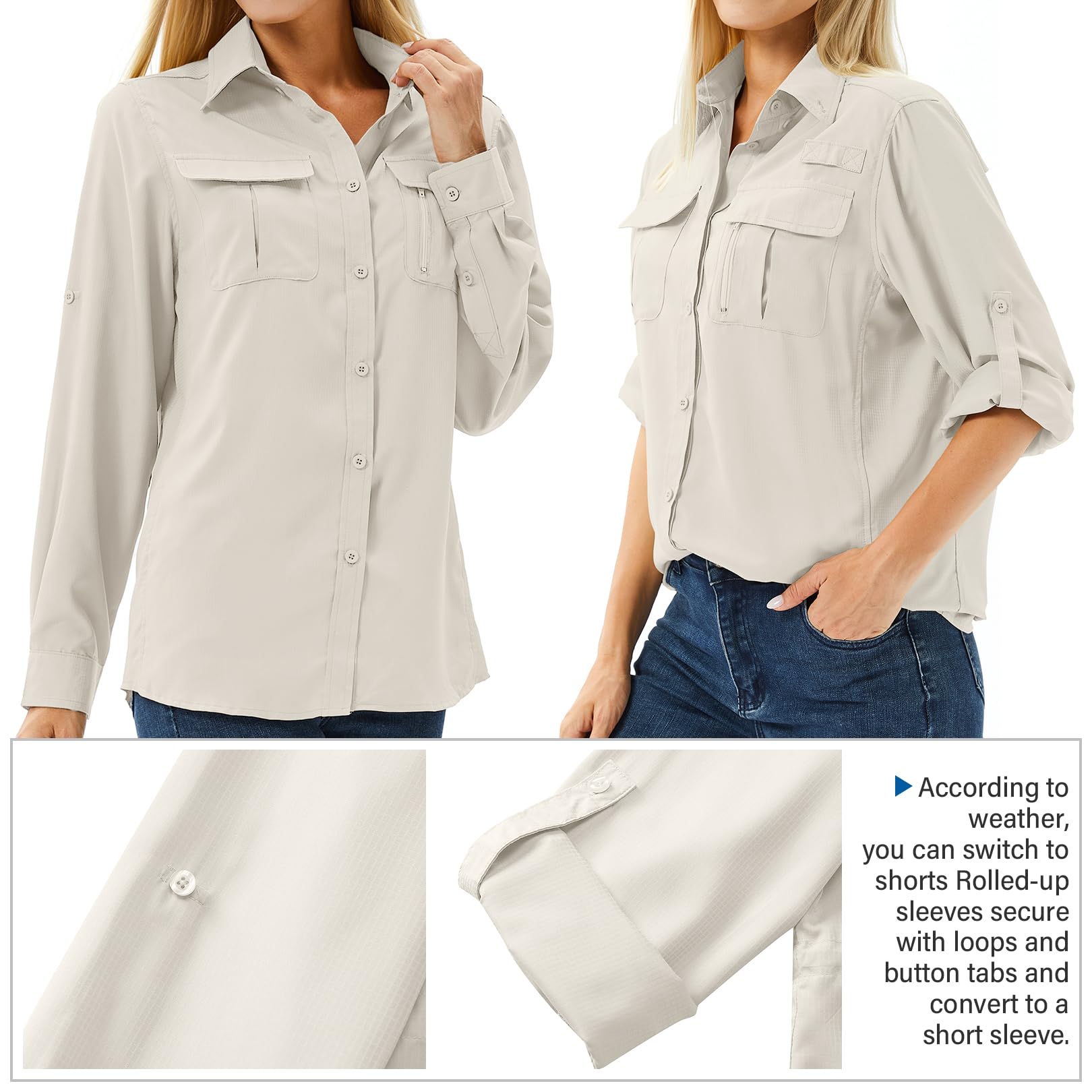 Long sleeve Hiking shirts:Women’s lightweight safari shirts features a mesh-lined vented back for breathability and comfort. Roll-up sleeves to convert long sleeves to short sleeves for hot days.