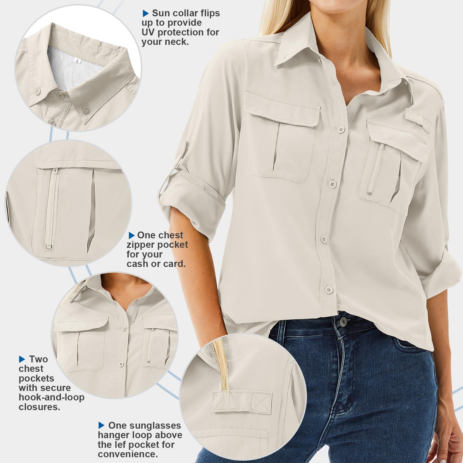 Safari Clothes for Women:Long sleeve button up shirt women features two handy chest pockets for conveinent storing and one sunglasses hanger loop above the left pocket.