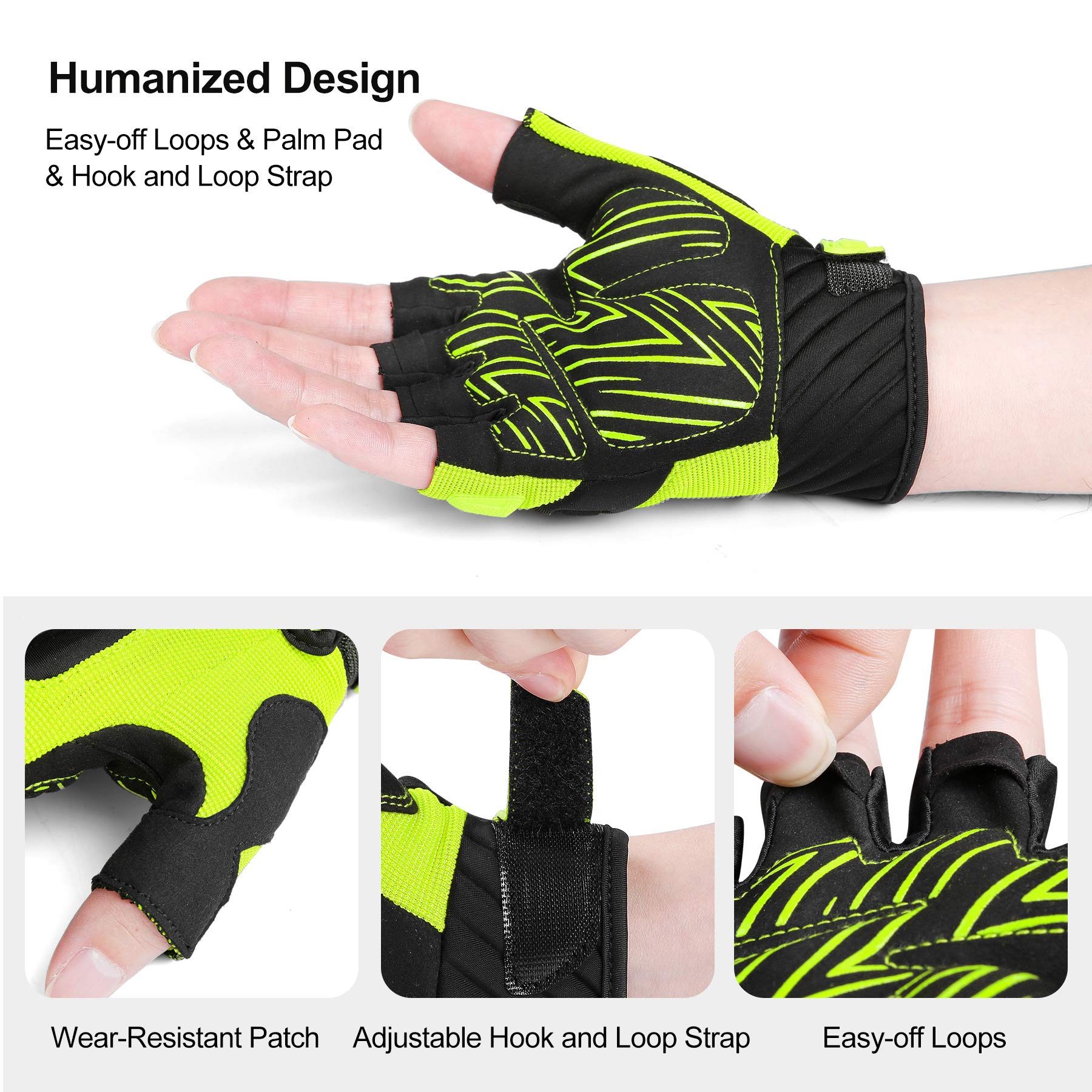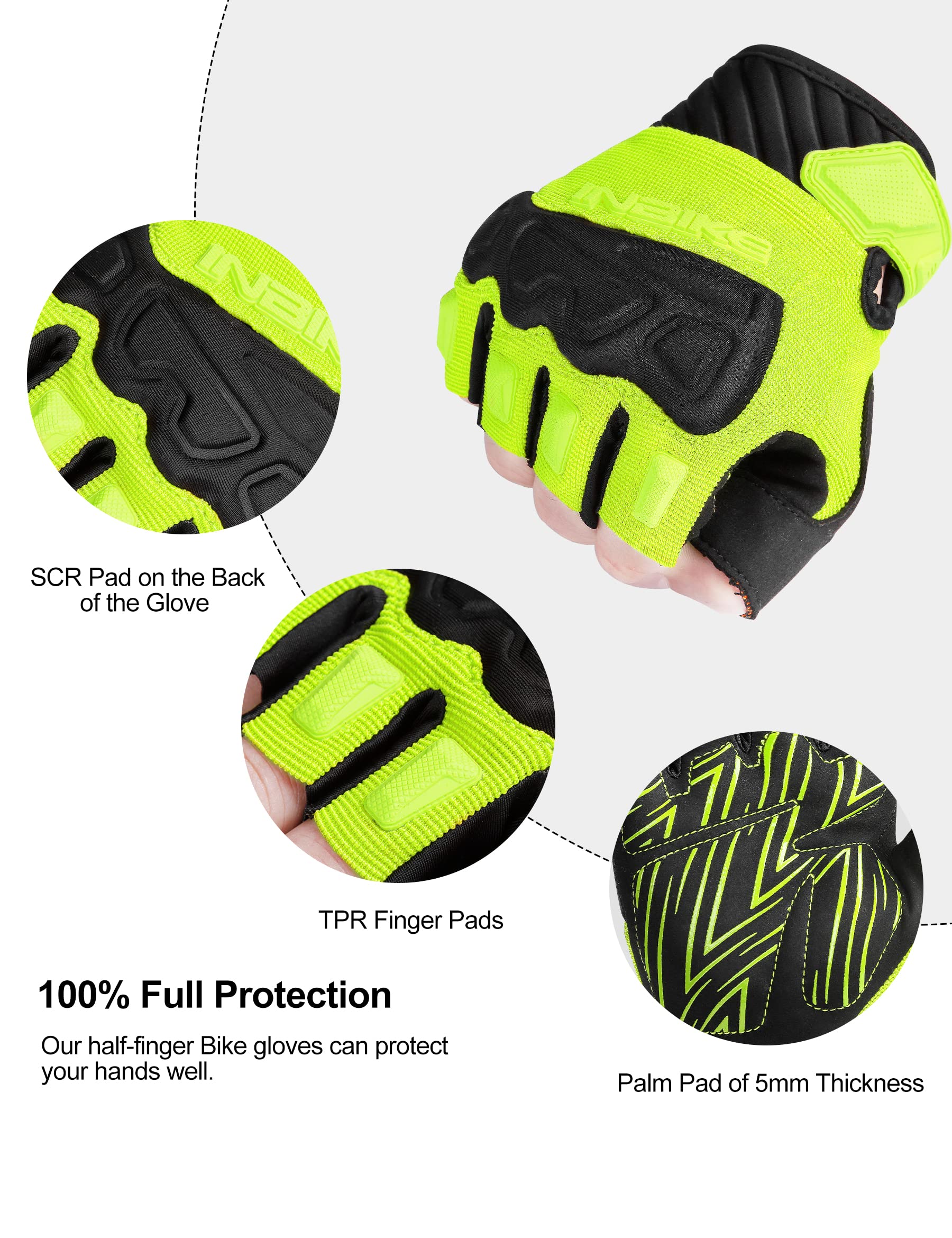 【Humanized Design】INBIKE cycling gloves perform its high quality in full details. Hook and loop strap helps you adjust the tightness to make half-finger cycling glove fit you. It is also convenient to take off the half-finger gloves with the easy-off loops which are designed on the middle finger and ring finger. Comfortable hemming protects wrist while absorb sweat.