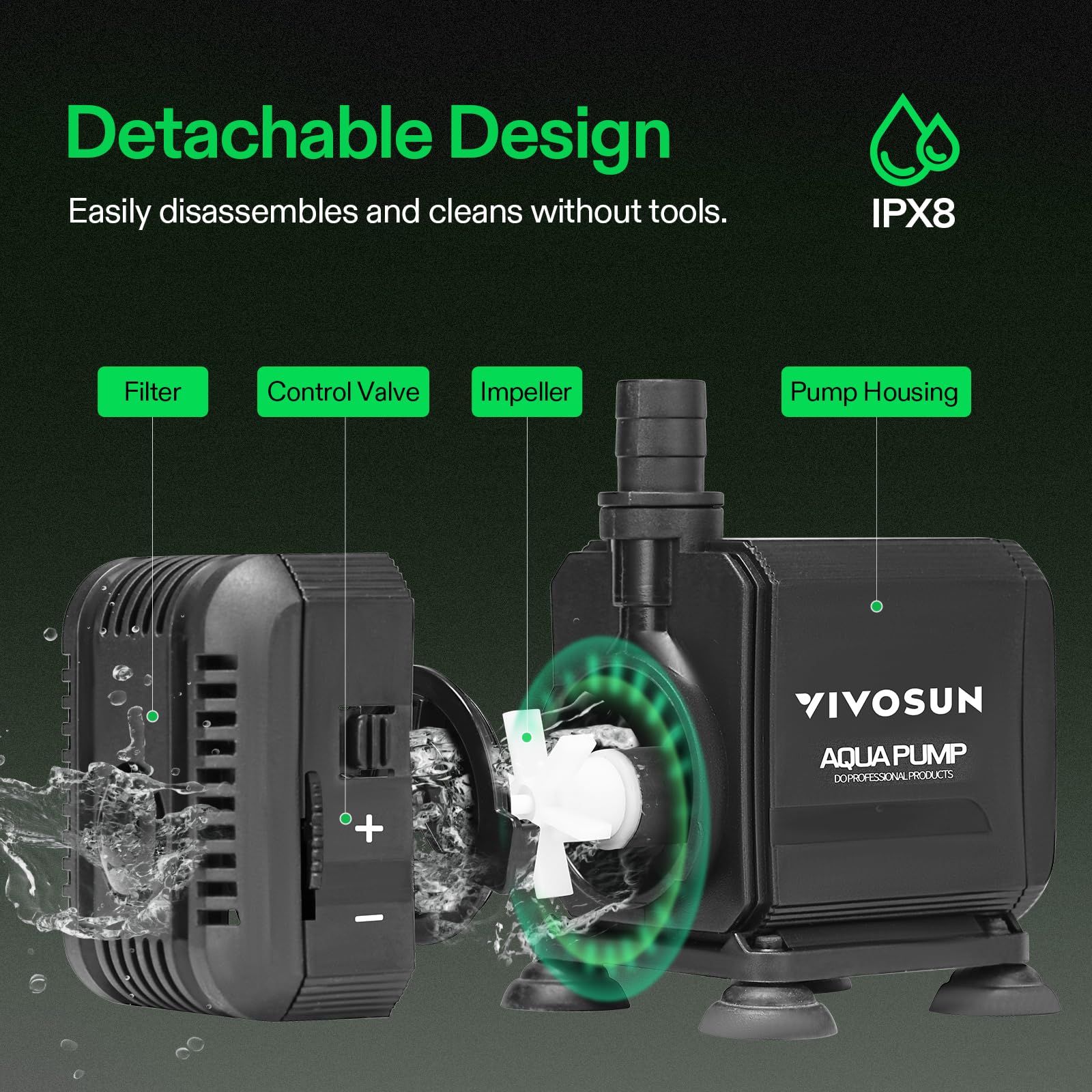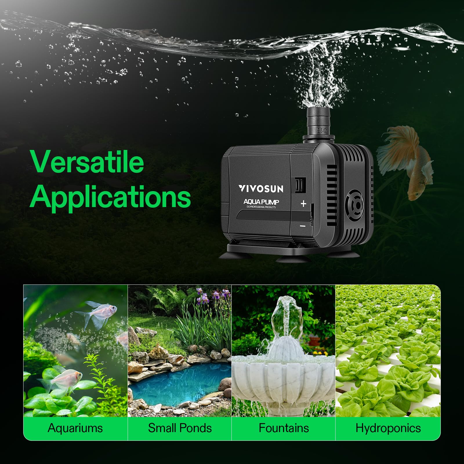 Wide Range of Application: High performance energy-efficient pump designed for use in ponds, fountains, waterfalls, hydroponic systems, irrigation systems and other water features