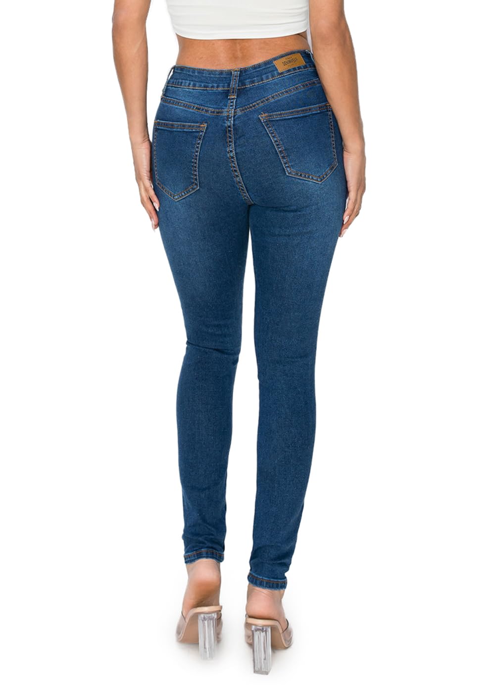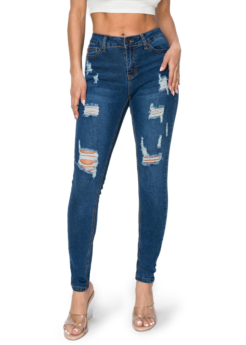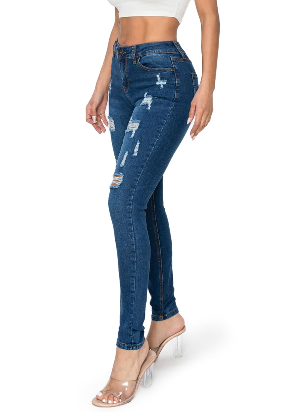Description Our High Waisted Distressed Skinny Jeans are a must have this Fall for the back to school season! These unique and trendy skinny jeans feature a slim stretch fit, ankle length hem, front zipper & button closure, high waisted silhouette, and distressed ripped detailing. Complete the look with a cute top, faux leather moto jacket, and flat ankle booties.