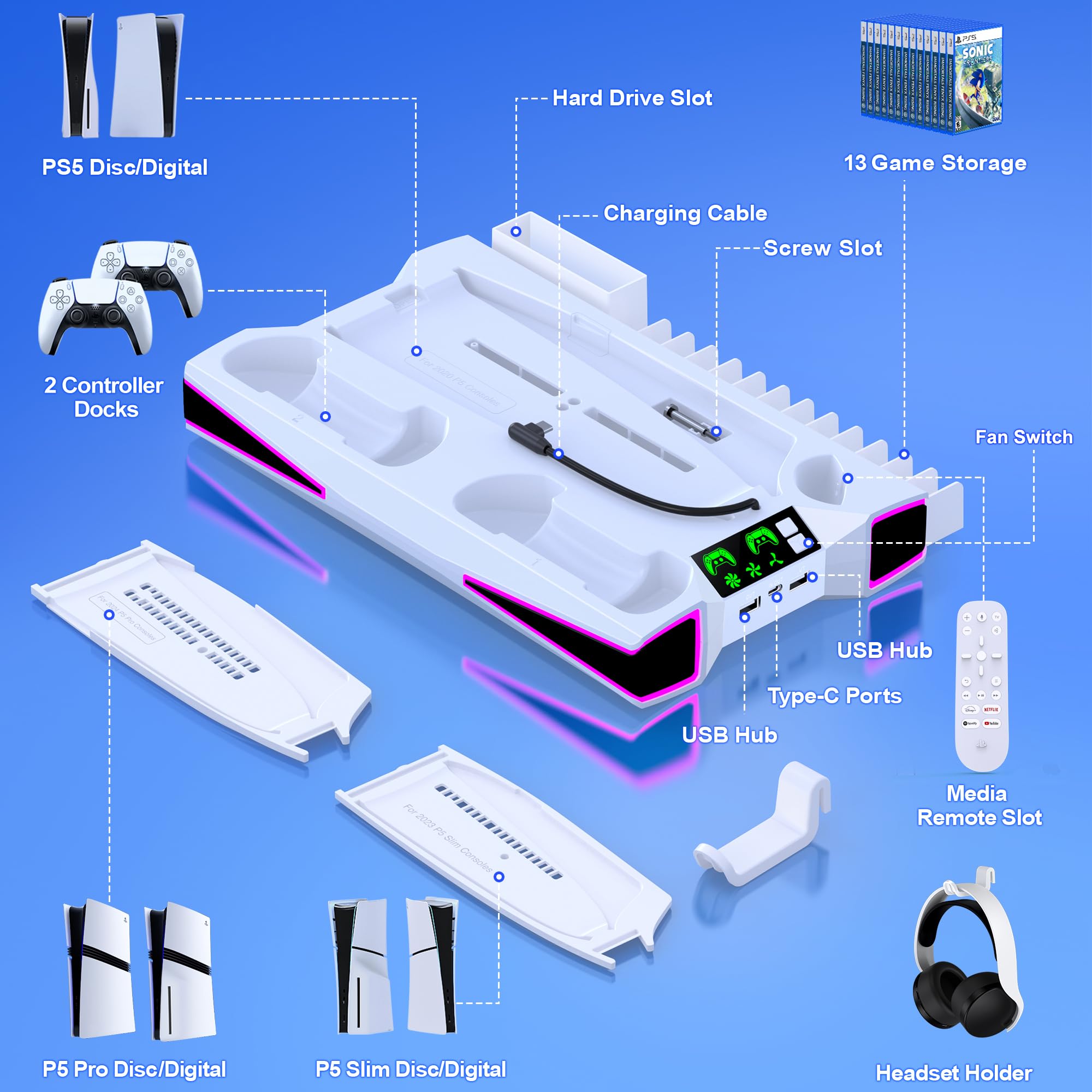 Game On with the Ultimate PS5 Cooling Stand: Level up your gaming setup with our all-in-one ps5 cooling station, this ps5 accessories station designed for both PS5 Pro/PS5 /PS5 Slim. Secure your ps5 console in style and keep it safe while you dive into epic adventures