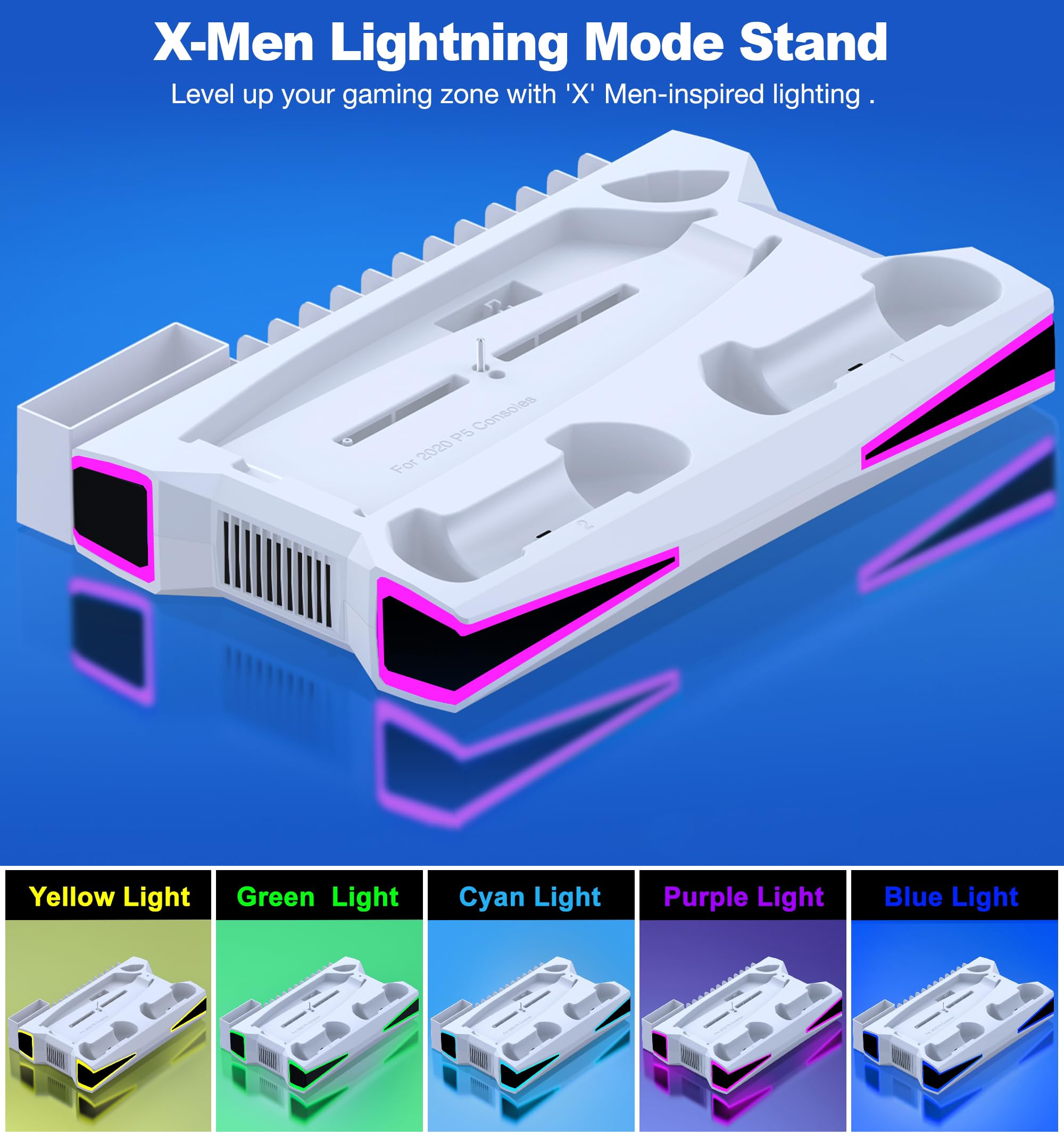 Organize Your Gaming Gear: Keep your gaming space as epic as your gameplay! Our ps5 cooling&charging dock holds up to 13 game discs, your headset, and the PS5 media remote, all while adding stylish Colorful lighting and three extra charging ports for your devices. Say hello to a tidy and organized setup!