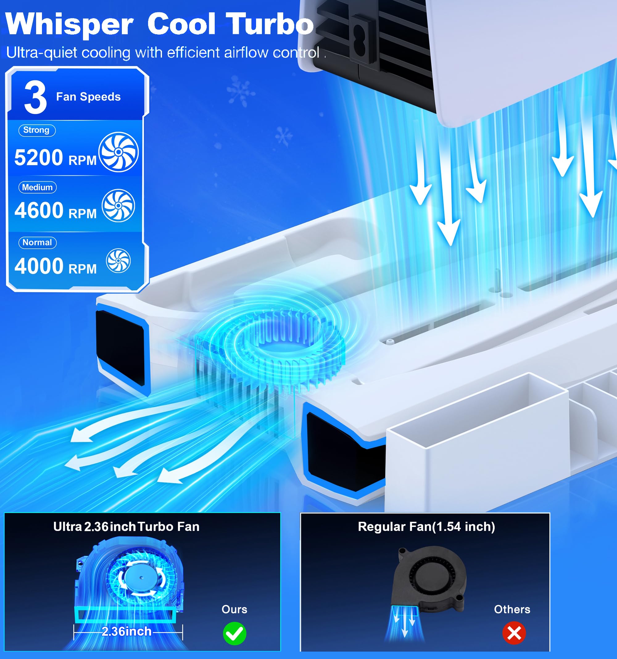 Tubocharged Cooling Power: Say goodbye to overheating! Our upgraded 100W turbo cooling fan for ps5 cranks up the cooling power by 3x, with three adjustable speeds to keep things chill during your most intense gaming marathons. Plus, ps5 cooling station remembers your favorite fan speed!—just like your trusty sidekick