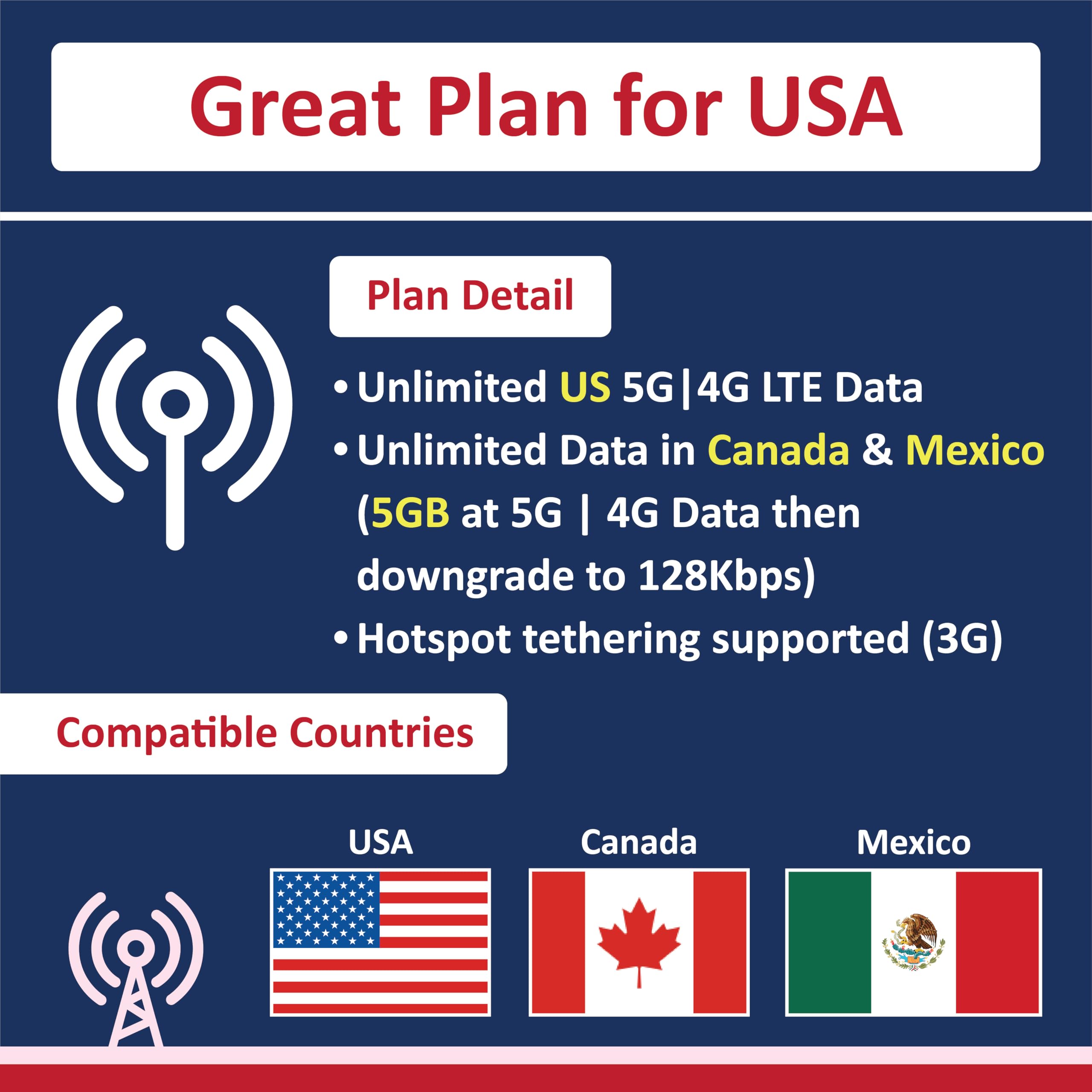 US Prepaid SIM for 21 Days. This product uses US local native network. Plan Details Data Unlimited 5G | 4G High-Speed Data in USA nation-wide (Hawaii is included). 5GB Data at 5G | 4G High-Speed data in Canada and Mexico. Phone Calls and Texts Unlimited Calls and Texts among United States nation-wide (Hawaii is included), CA and Mexico. Phone Number The SIM comes with a local US phone number You will get the local US number the day before your scheduled activation date. 1 Easy Step to activate your SIM card Simply fill in activation form 3 days before your departure, you will be able to enjoy the sim upon arriving with NO extra roaming fee. Device Compatibility iPhone users have to be iPhone 8 or newer version. Please Check device compatibility before purchasing. (Please go to T-Mobile website searching "bring-your-own-phone"). Customer Service Support Local English Customer Service supported. Special Notice Make sure your phone is UNLOCKED. SIM activation during weekends and US national holidays may be delayed.(GMT+8) The plan is refillable. This product is NOT compatible with Wifi hotspot devices, pad phones, and Carrier-Locked phones. Please note that Sim2Roam will not be responsible for any problems due to device incompatibility.