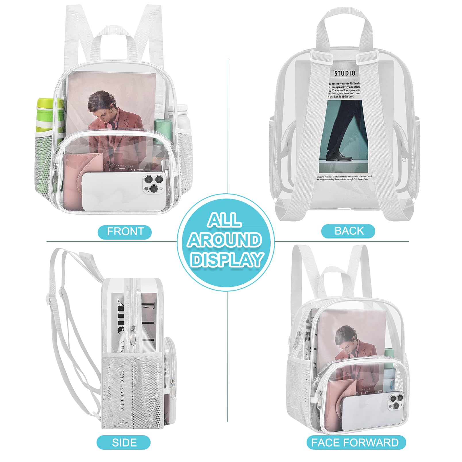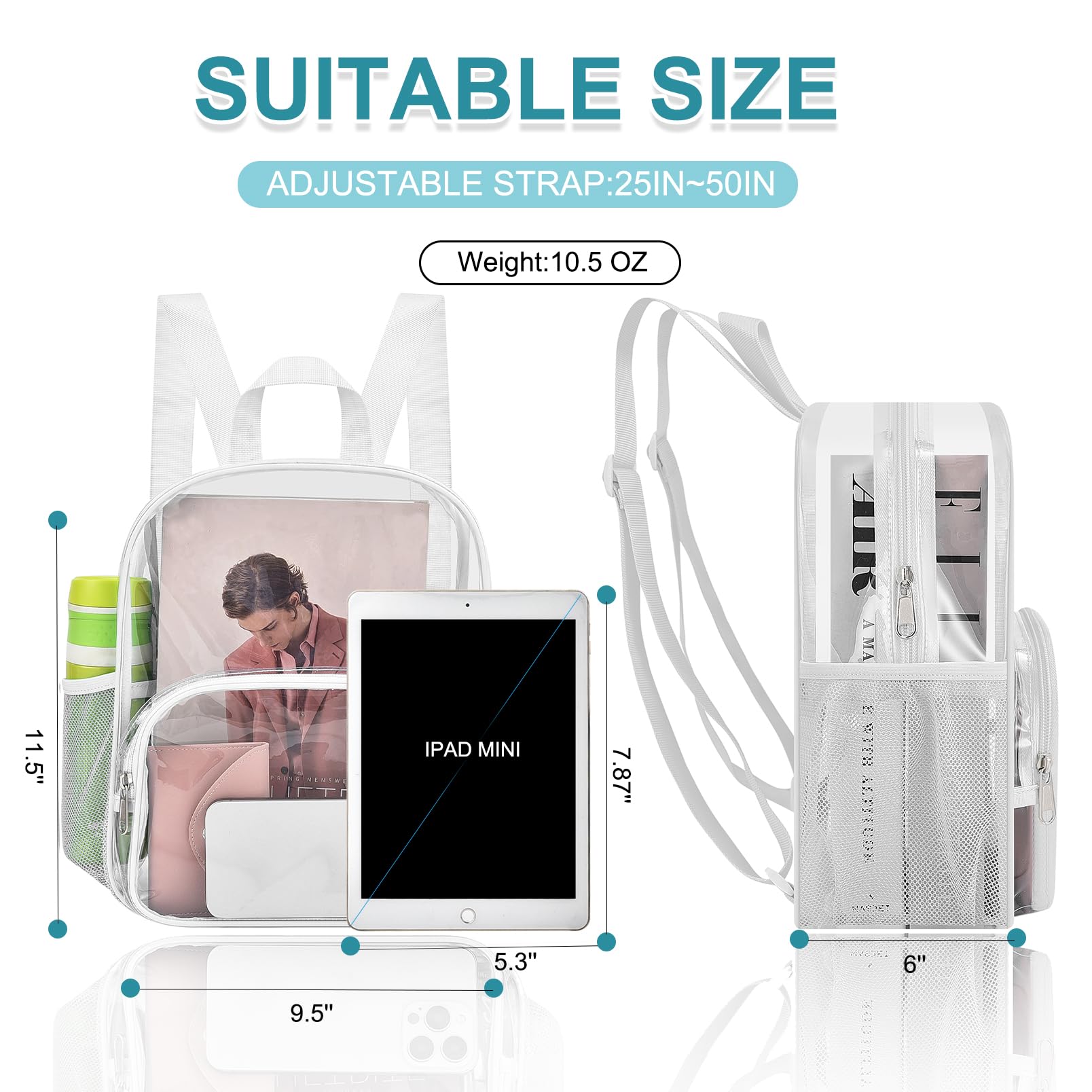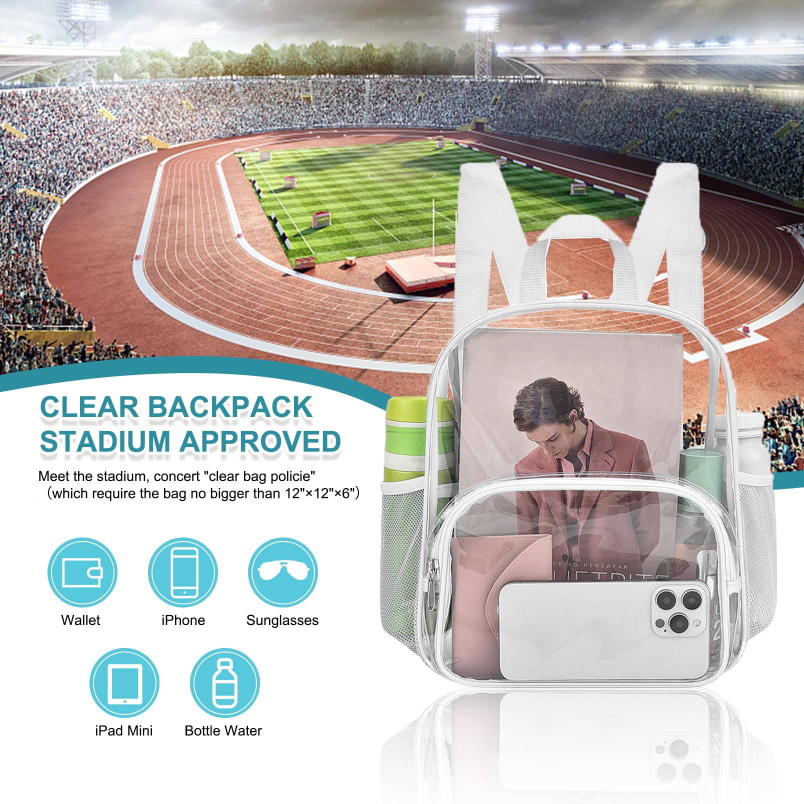 【Clear Backpack for Stadium Events】Size 11.5"L x 6"W x 9.5"H, effortlessly comply with clear bag policies of no larger than 12*12*6 inches,making it ideal forstadiums, concerts and sports events.