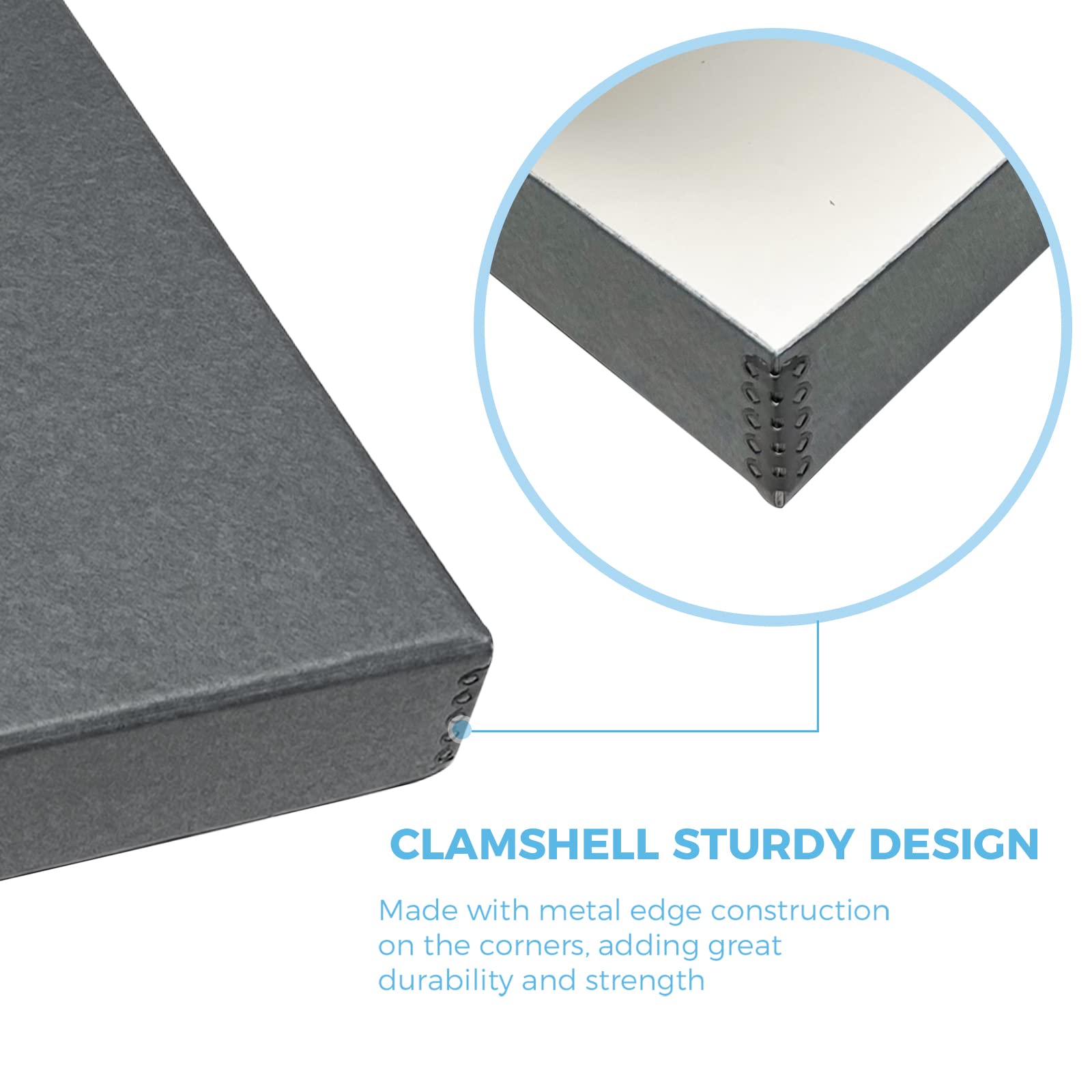 Acid-free and Lignin-free boxes manufactured in the US from Gray 60pt archival boxboard with metal edge construction for additional strength