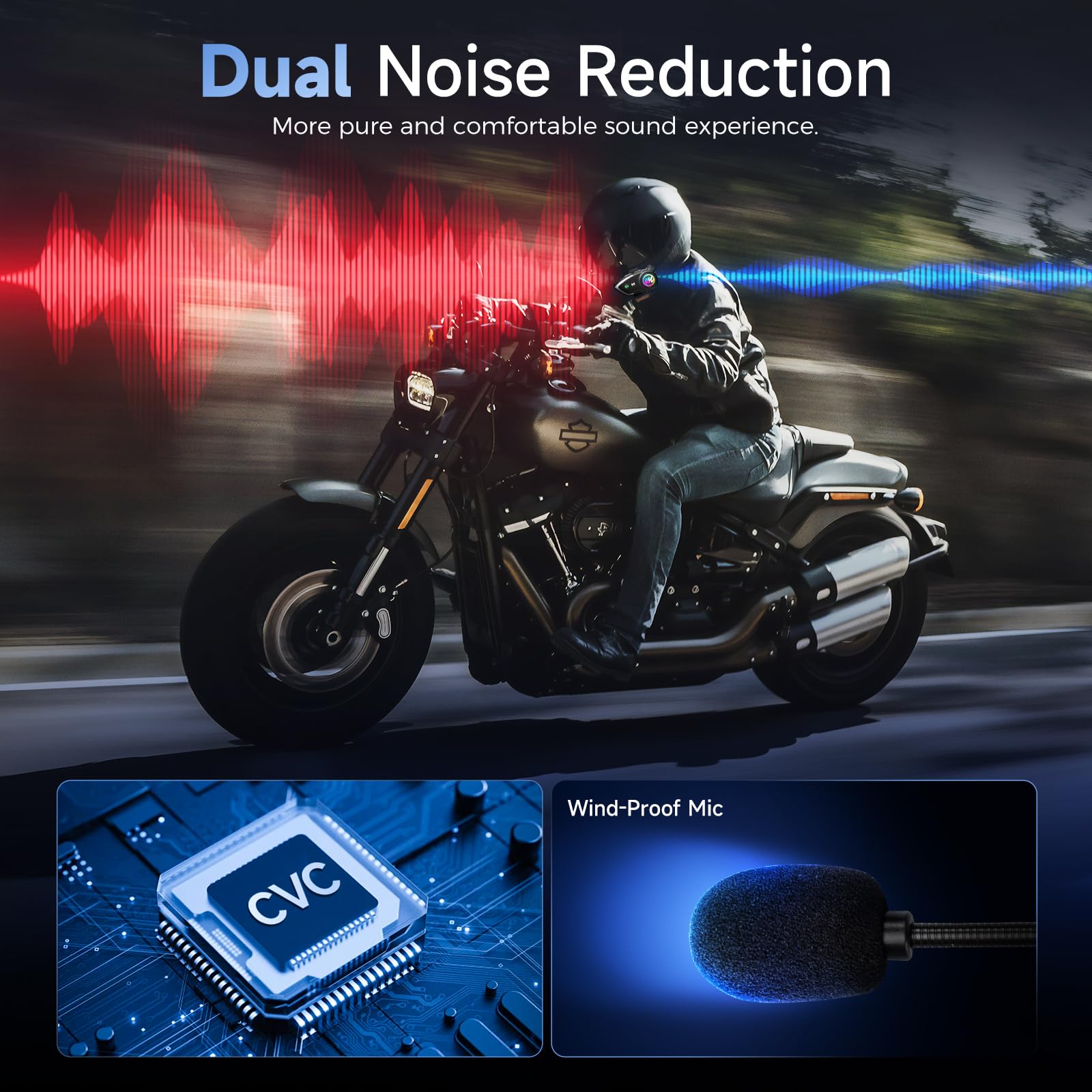 【Hi-Fi Stereo & Dual Noise Reduction】Moman H1 motorcycle intercom combines Hi-Fi stereo sound with advanced noise cancellation technology. Its 40mm high-fidelity driver delivers rich audio and clear call quality, ensuring an immersive experience. Featuring dual noise cancellation with a CVC chip and a windproof microphone, it effectively reduces background noise for crystal-clear communication.