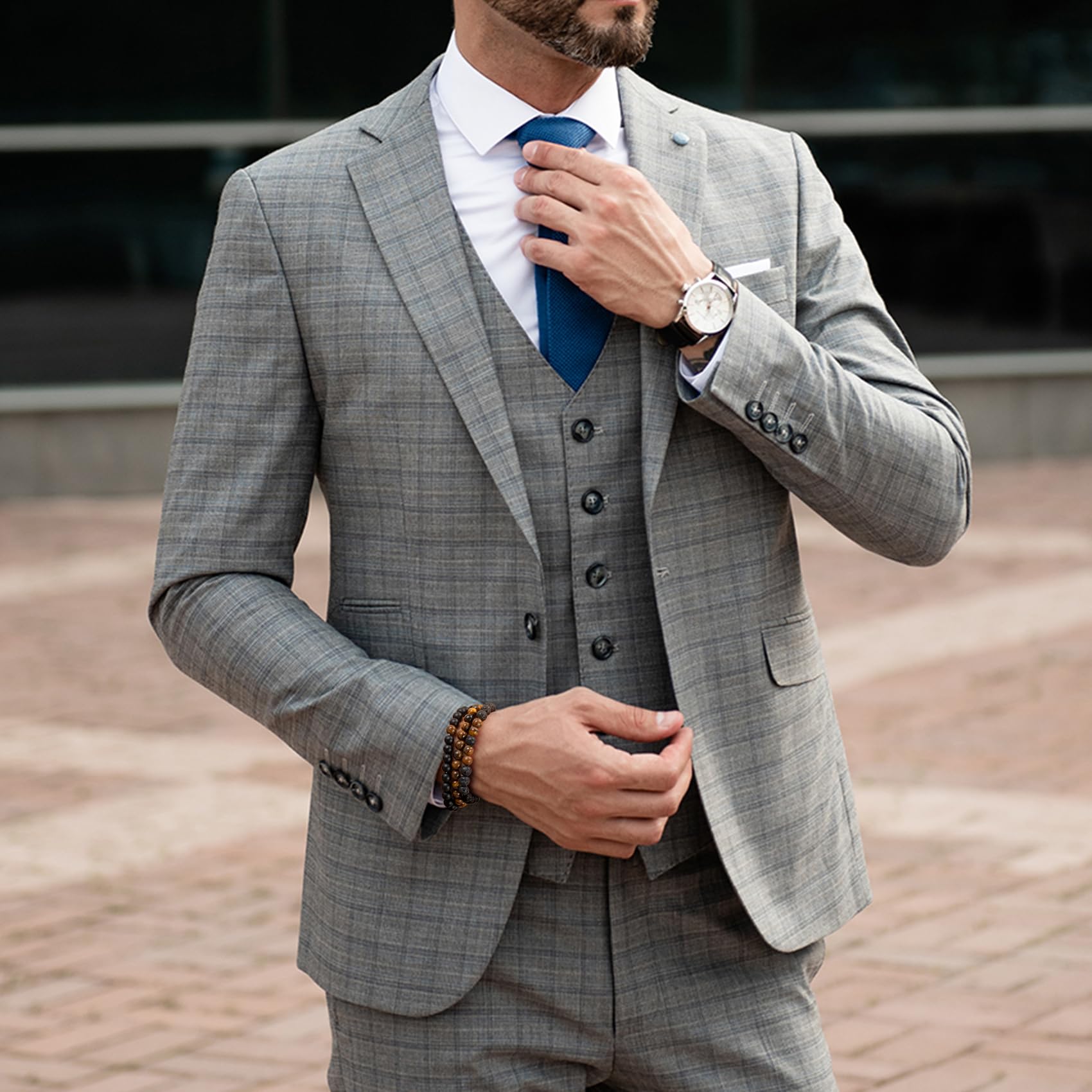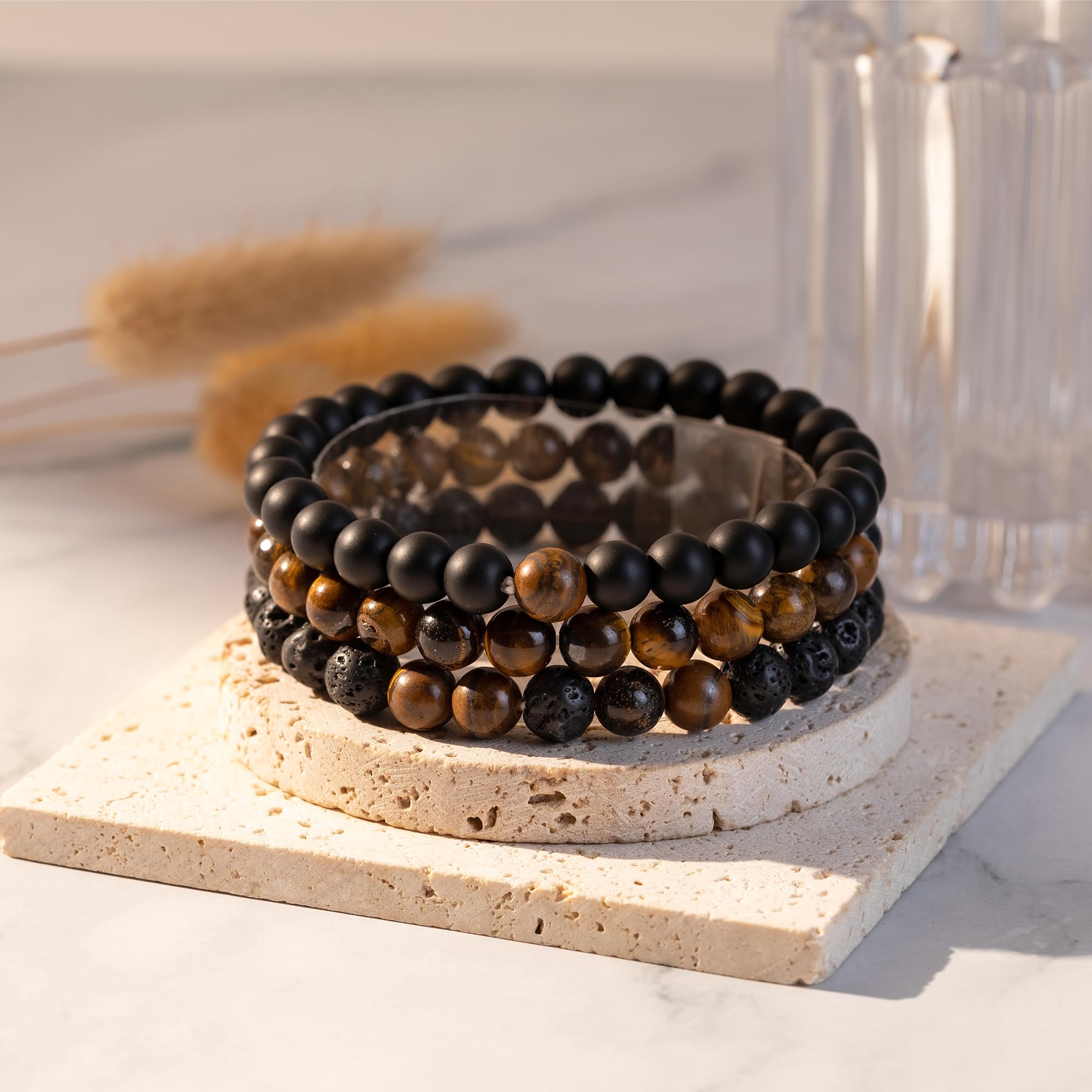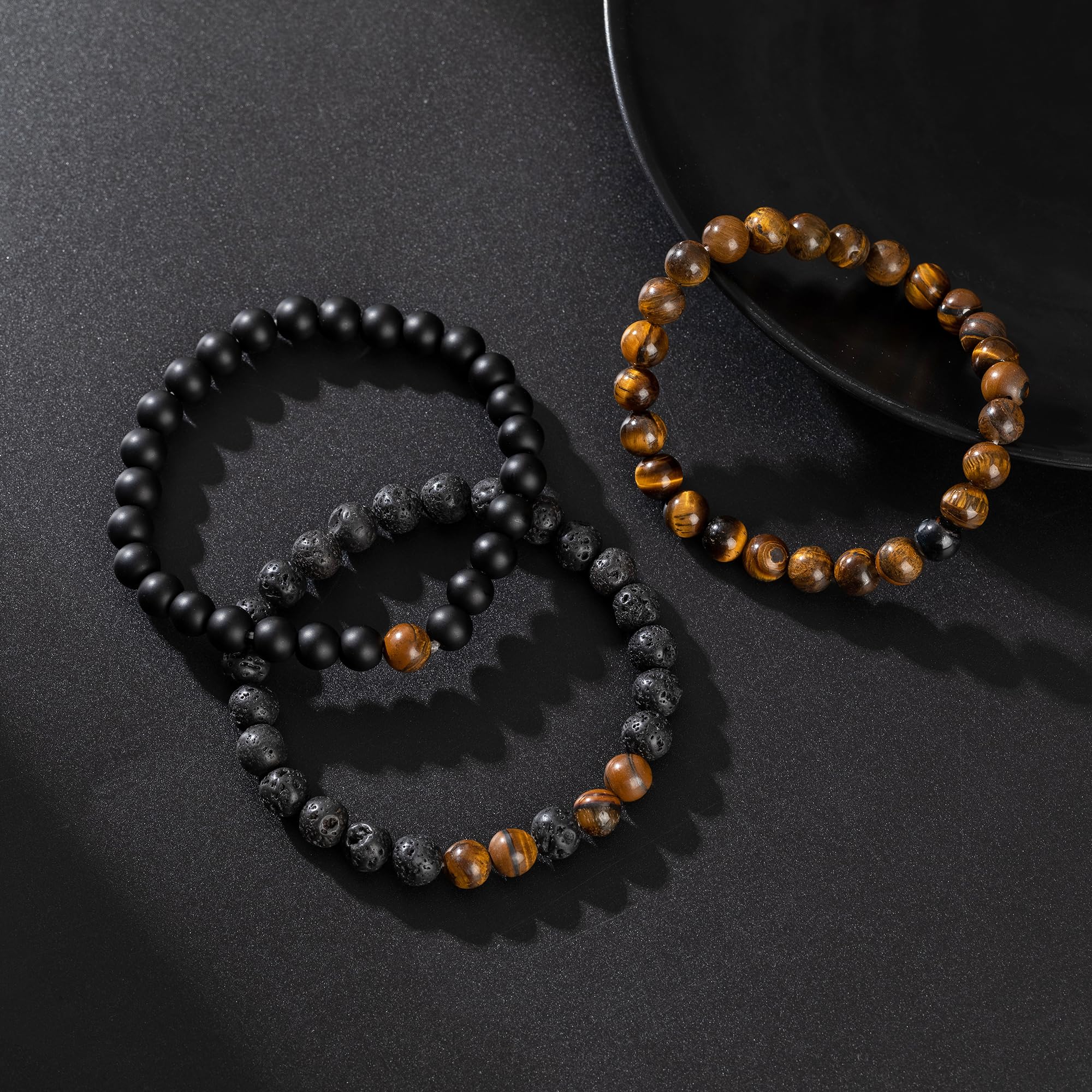 [Bead Bracelet Set]: The men's bracelets consists of 3 bead set bracelets, including lava stone bracelet, black beads bracelets, tigers eye bracelet. Different styles of beads meet all the needs of daily matching.