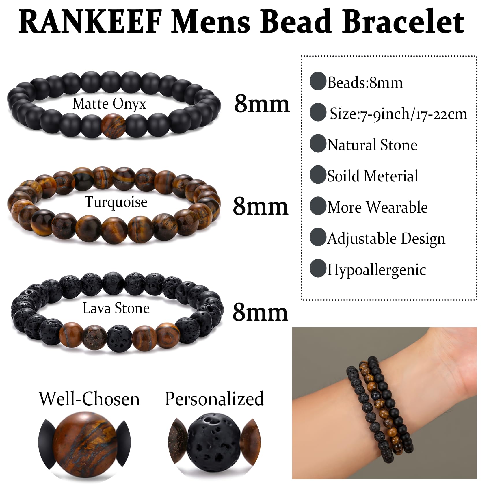 [RANKEEF SERVICE]: RANKEEF always provides high quality jewelry and excellent service to our customers. If you have any questions or are not satisfied with our beaded bracelets for men, please feel free to contact me, we will provide you with service and help 24 hours a day.