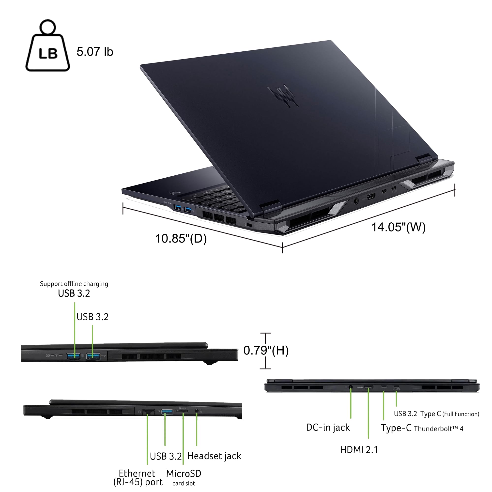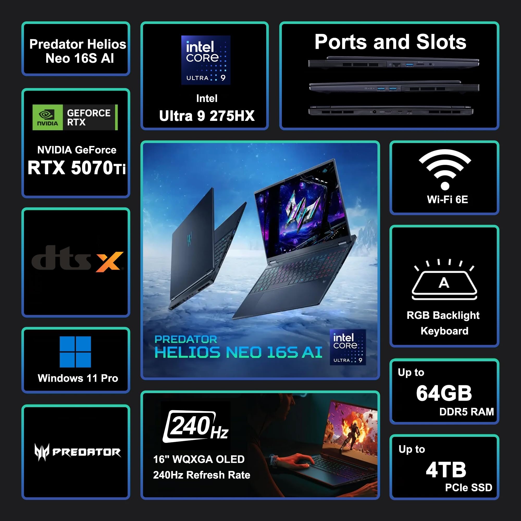 Product Details: Microprocessor: Intel 24-core Ultra 9 275HX Processor (Base Clock 2.7GHz, Max Boost Clock Up to 5.4GHz, 40MB Smart Cache, 24 Threads) Memory: 64GB RAM Storage: 2TB SSD Operating system: Microsoft Windows 11 Professional Graphics & Video: Dedicated NVIDIA GeForce RTX 5070 Ti 12GB Graphic 16" WQXGA (2560 x 1600) OLED 240Hz (100% DCI-P3, G-SYNC) Key Features: RGB Backlit Keyboard: Yes Wi-Fi 6E: Yes DTS:X: Yes Ports: 3 x USB-A 3.2, 2 x USB-C 3.2, 1 x HDMI 2.1, 1 x RJ45 Gigabit Ethernet, 1 x MicroSD Card Reader Battery: 76Wh Additional Information: Dimension: 10.85" x 14.05" x 0.79" Weight: 5.07 lbs