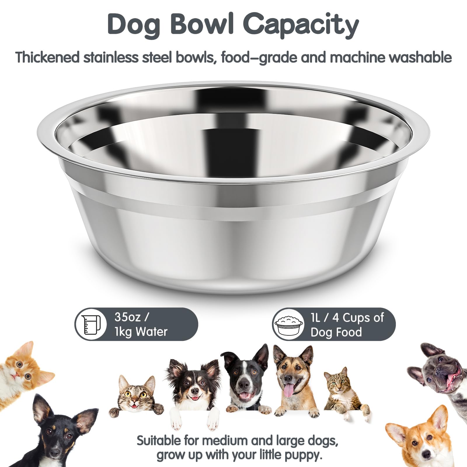 DUAL STAINLESS STEEL DOG BOWLS: Comes with two dog bowls for water or food and measures 7.87x 2.56 inch, which will meet the feeding needs of most dogs for a day. Easy to detachable and clean, dishwasher friendly. Compared with plastic, the oil in dog food can be cleaned more easily to avoid causing problems such as black chin, more secure and reliable.