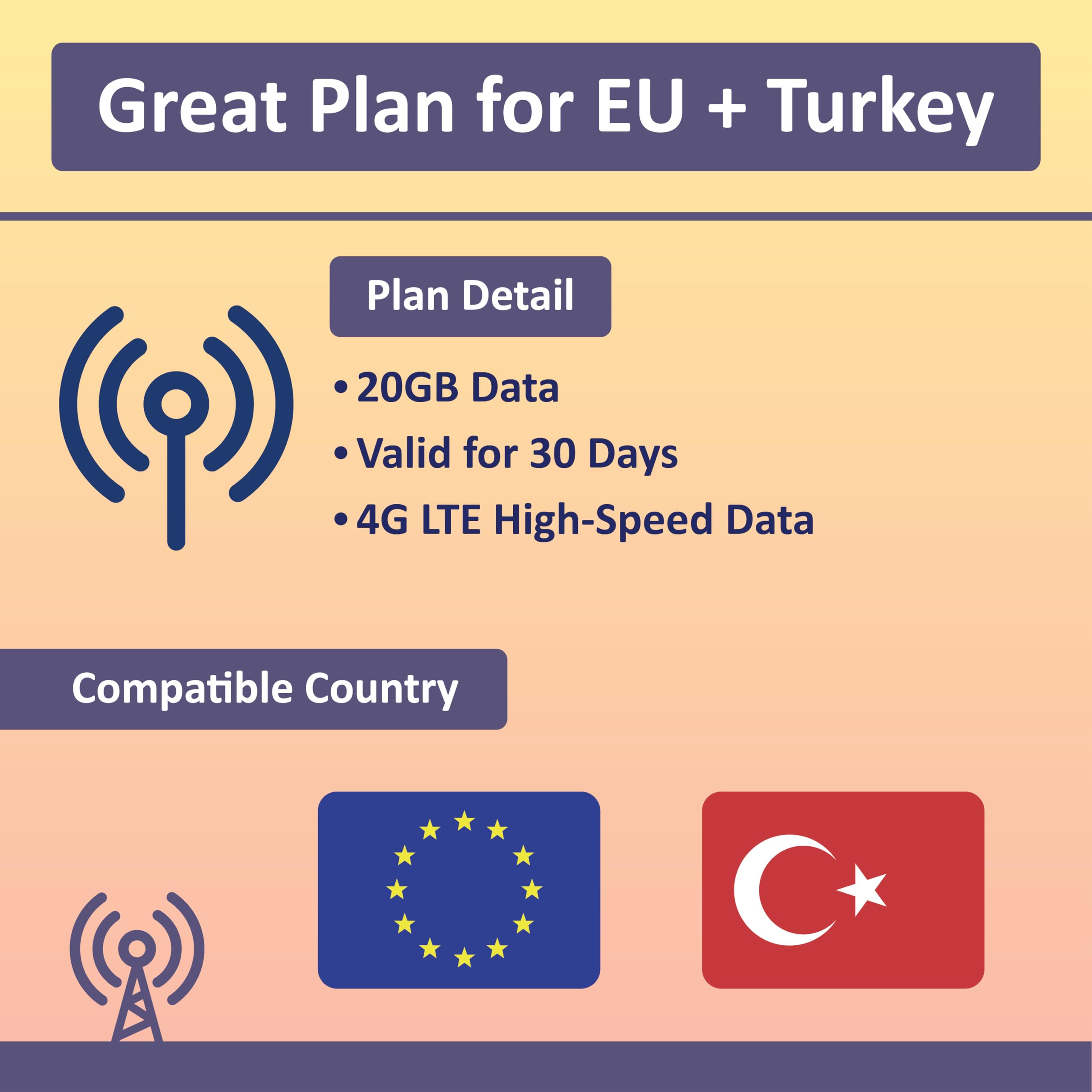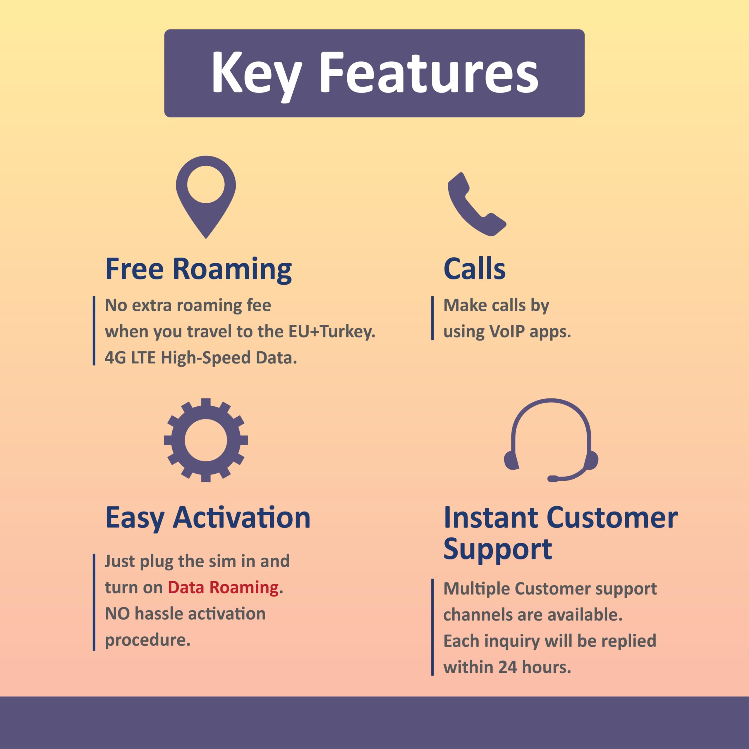 EU+Turkey Data Sim - Plug and GO - NO registration, ID authentication needed. Plan Detail Good for 30 days (Starting from the first connection to the network). 20GB of High-Speed 4G LTE Data. Available for Hotspot tethering (only for Mobile phones). The SIM card is NOT available for routers. No callings, No SMS, No refill available. Covers more than 33 countries in Europe: Austria, Belgium, Bulgaria, Croatia, Czech, Cyprus, Denmark, England, Estonia, France, Finland, Greece, Germany, Hungary, Italy, Ireland, Iceland, Lithuania, Latvia, Luxembourg, Liechtenstein, Malta, Netherlands, Norway, Poland, Portugal, Romania, Spain, Switzerland, Slovakia, Sweden, Slovenia, Turkey. 1 Step SIM Card Activation No activation registration is needed. Simply insert the SIM into your mobile phone and turn on the Mobile Data and Data Roaming when you arrive at the destination. Your device should automatically detect and connect with local Network carriers within 3 minutes and then you are ready to roam! If your phone does not work automatically, please follow our English user instructions printed on the package. Terms and Conditions (Please read before purchase) Please prepare an unlocked device. Do Not support CDMA, locked, Blackberry, or Windows devices We will try our best but do not guarantee that every phone can connect to the service Any connection failure due to bad weather or rural areas is the responsibility of the local service provider. Roaming Saver will try our best to reflect your issue to the supplier but cannot compensate for the possible damage or loss Please inform us if any loss, error, or failure happens on your device within 24 hours.