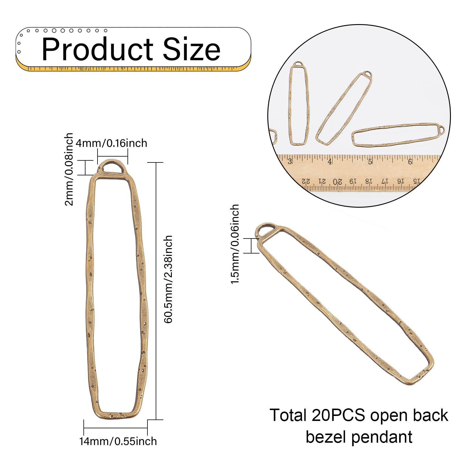 Enough Quantity: The package include 20Pcs antique blue alloy open back bezel pendant with the size of 0.55 inch(14mm) wide, 2.38 inch(60.5mm) long, 0.06 inch(1.5mm) thick, Hole: 0.16x0.08 inch(4x2mm), the enough quantity and proper size can meet your daily needs to use and DIY craft