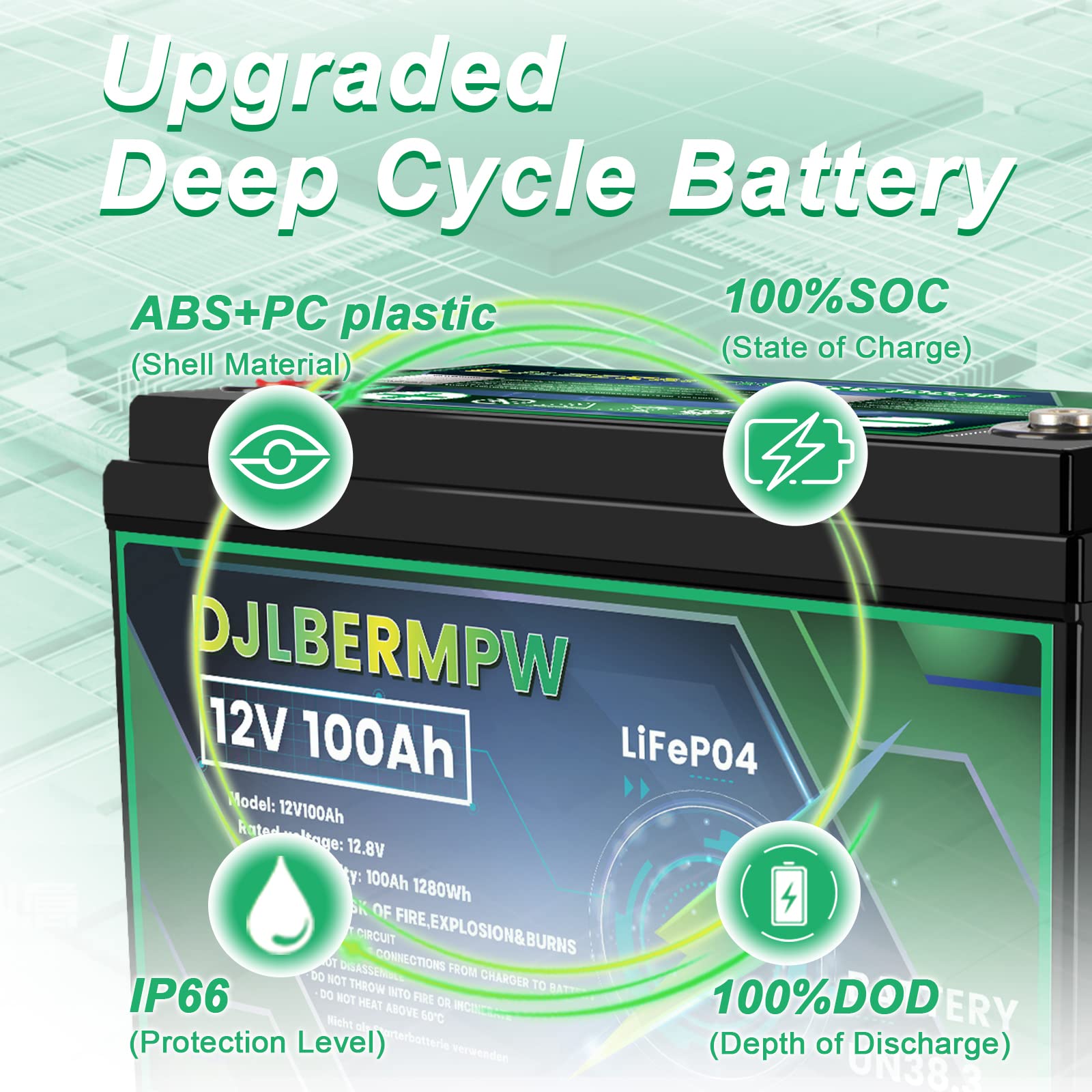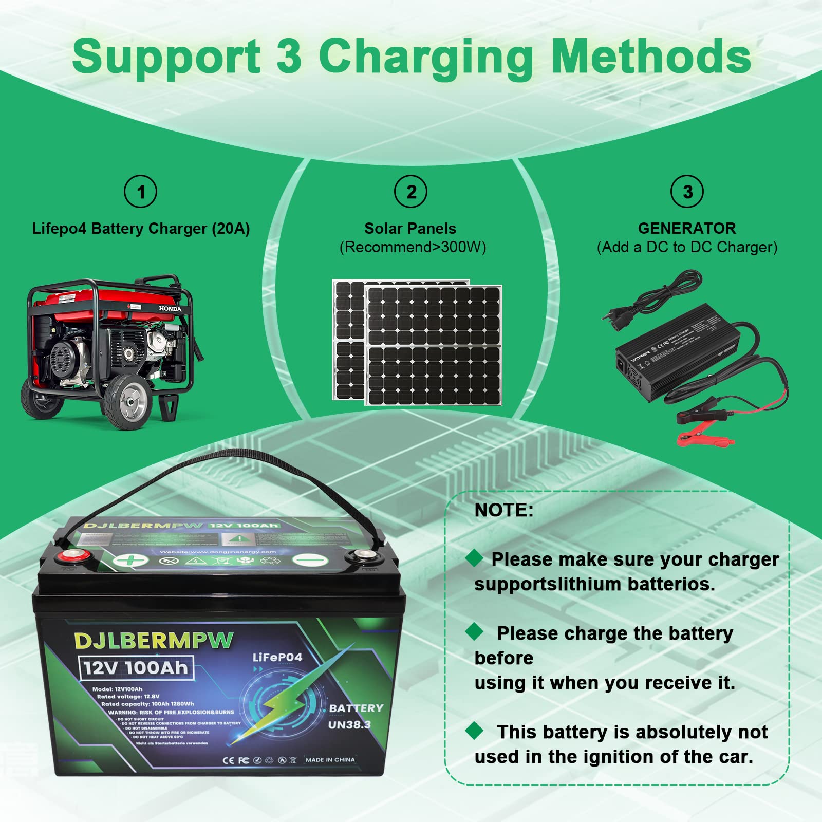 【Battery Application & Charging】:DJLBERMPW 12V 100Ah LiFePO4 battery can be used for: home energy storage systems, UPS backup power, lighting, fish finder, golf carts, trolling motor, RV,campers,travel trailers, dump trailers. It is recommended to use a 14.6V 20A li-thium battery charger. After receiving the battery, please charge it before use. The battery is only 30-50% charged at the factory and may be out of power in your hands.