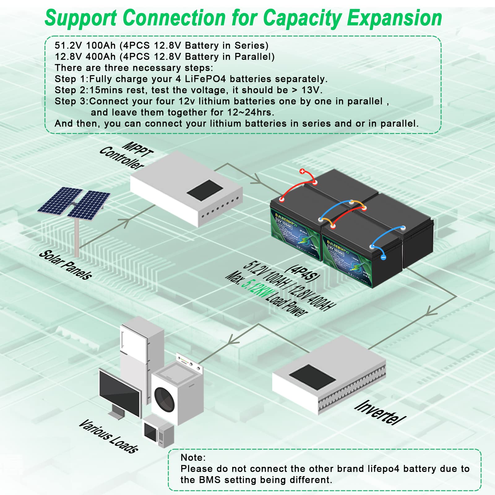 【Support Expansion】: DJLBERMPW LiFePO4 batteries can be connected in parallel or series to get more capacity and voltage. Max. series capacity: Up to 4 batteries of the same type can be connected in series, voltage up to 48 V. Parallel connection: Multiple batteries can be connected, it is recommended to connect no more than 4 batteries in parallel, the capacity can be up to 400Ah.
