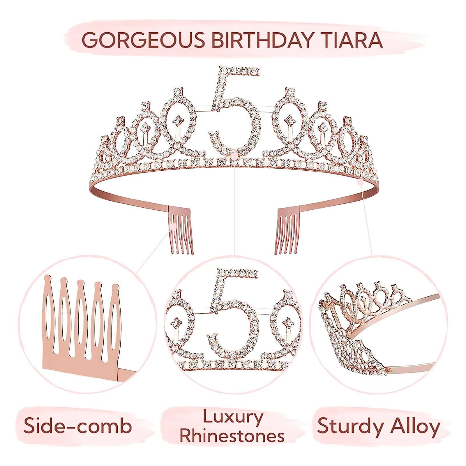 【5th Birthday Tiara】: The 5th birthday crown headband is made of quality alloy and shiny rhinestones, rose gold color highlights elegance. Crown with combs that make sure it can grip the hair more tightly for fitting girls.