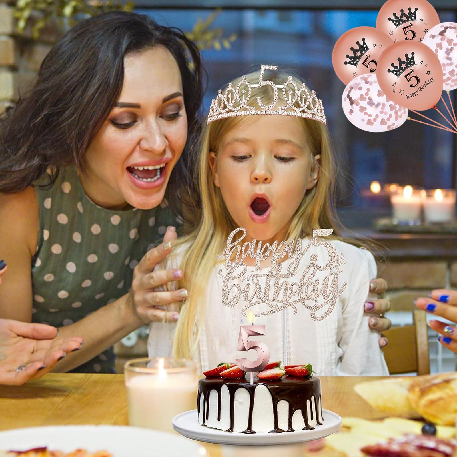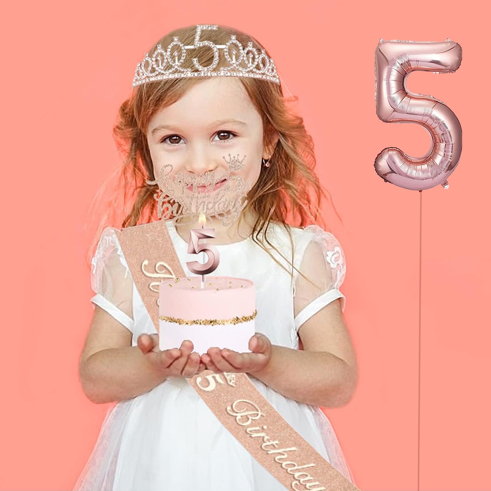 Hysilla 5th Birthday Decorations for Girls, 5th Birthday Sash, 5th Birthday Crown, 5th Birthday Cake Topper, Balloons, Pin and Candle Set, Rose Gold