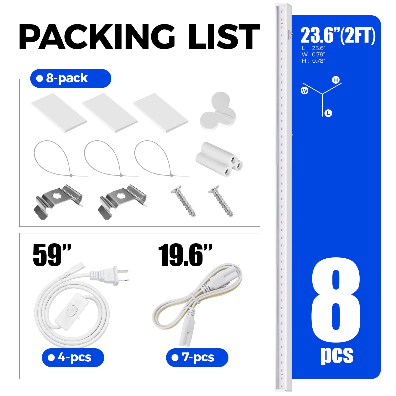 What You Get: 8 x Barrina T5 Grow lights, 4 x Power Cords with ON/OFF Switch, 7 x Connecting Cords, 8 x Small Connectors, 16 x Installation Clips, 24 x Double-sided Tapes, 24 x cable ties.