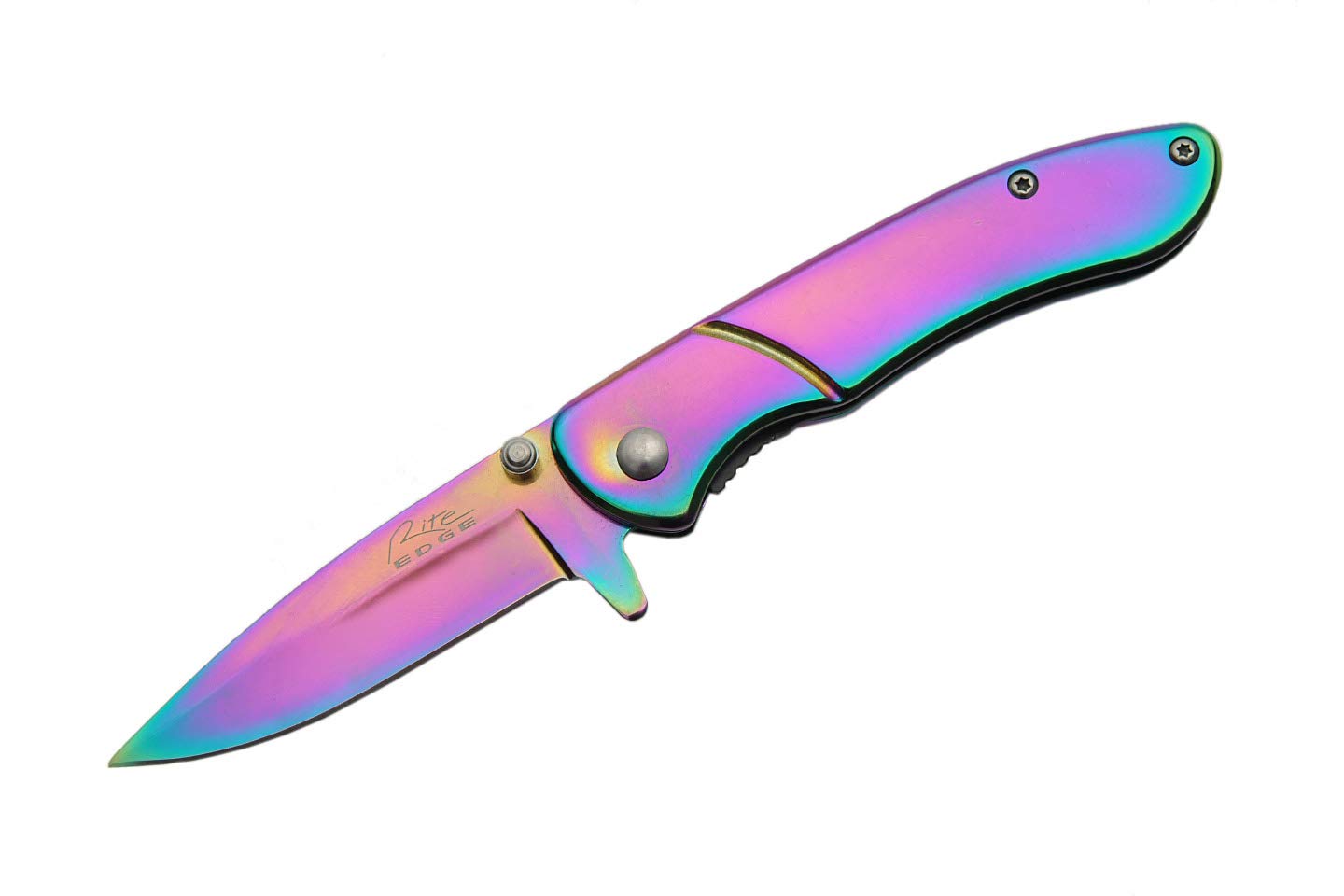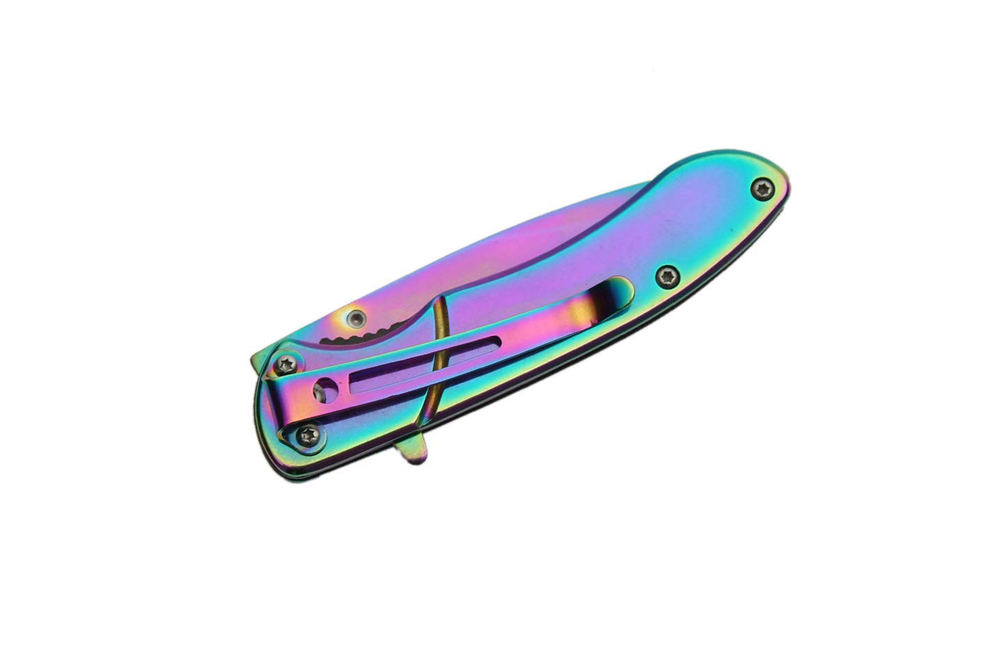This Titanium Spectrum Rainbow Assisted Opening Knife by Szco Supplies is 3.75 inches in closed length. The stainless steel blade has a rainbow titanium finish. The handle is also stainless steel with a rainbow titanium finish. This knife comes with attached pocket clip.