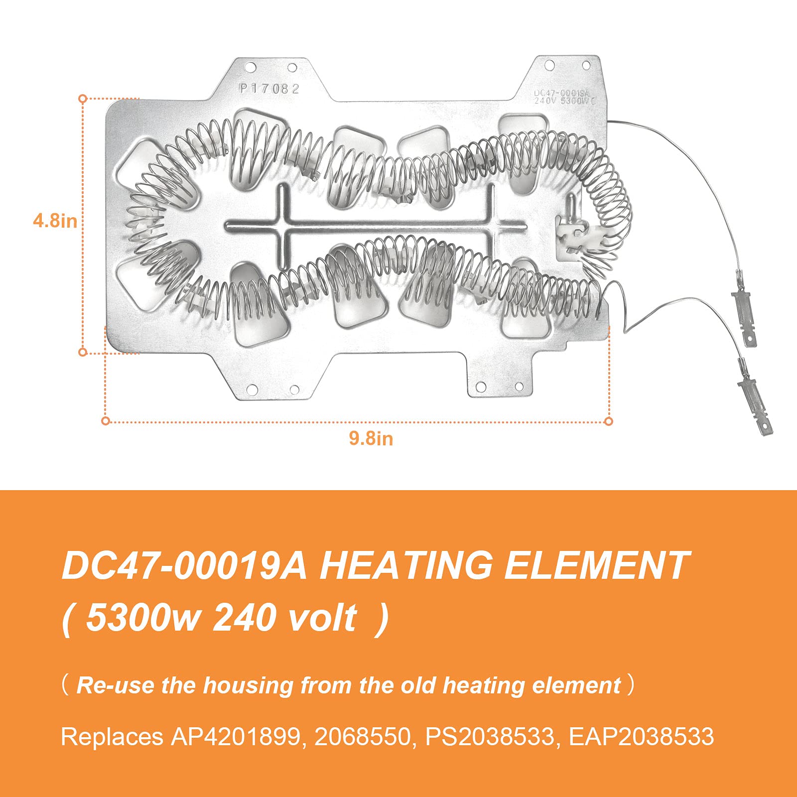 【PRODUCT SPECIFICATIONS】: Package includes 2 x DC47-00019A Dryer Heating Element Replacement Part (Brand new modified and upgraded replacement part). Rated at 5300 Watts 240 Volts with 1/4" terminals. This dryer heating element includes the insulators and restring coil, which are already attached for easy installation