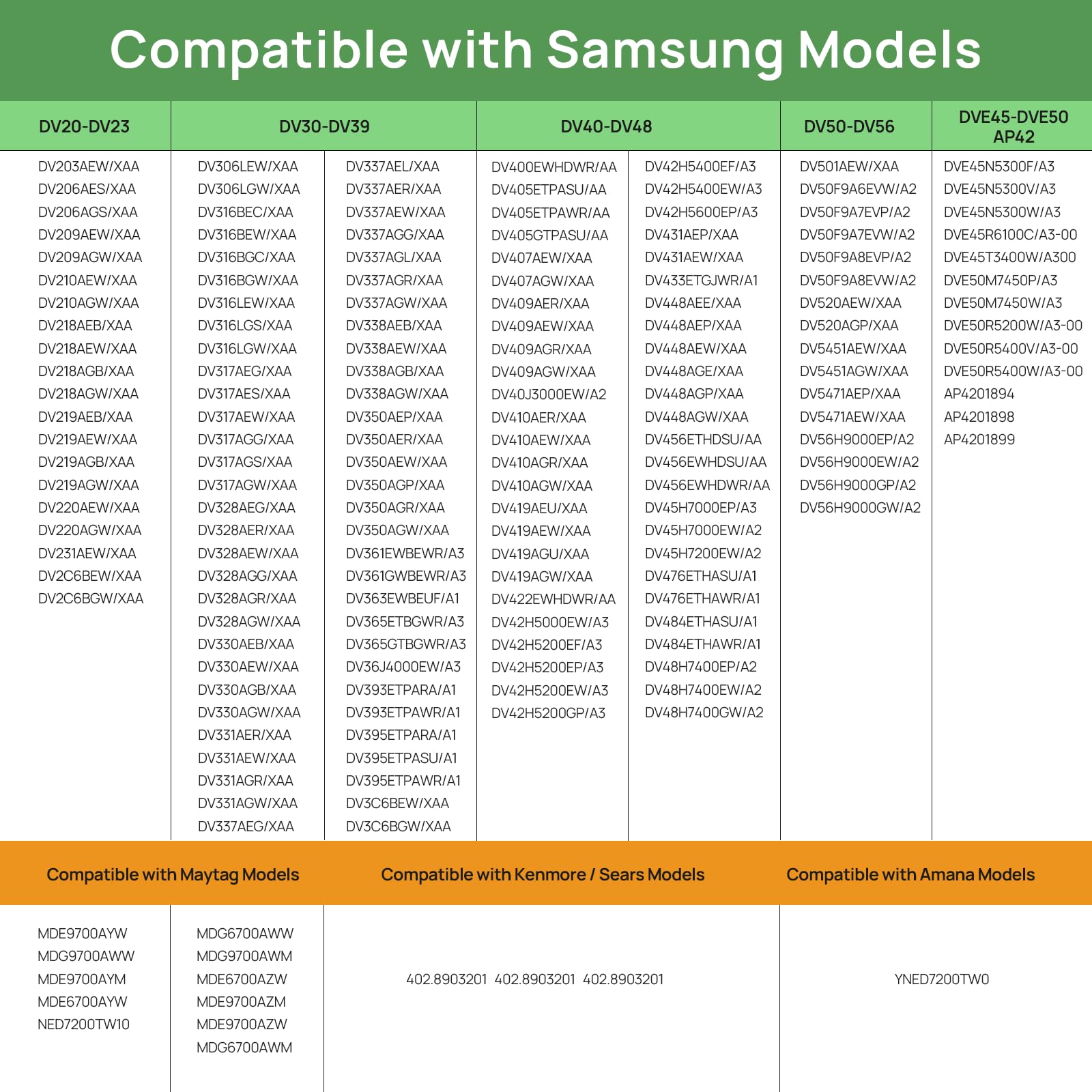 【PERFECT REPLACEMENT】: Compatible with Samsung and Kenmore dryer models: DV419AEUXAA0000, DV419AEUXAA0001, DV419AEWXAA0000, DV419AEWXAA0002, DV219AEWXAA0000, DV219AEWXAA0001, DV220AEWXAA, DV410AERXAA, DV209AEWXAA0000, DV209AEWXAA0001, DV231AEWXAA0001, 40289032010, 40289032011, 40289032012. Replaces part # PD00001991, DC47-00019A, AP4201899, 2068550, PS2038533, EAP2038533