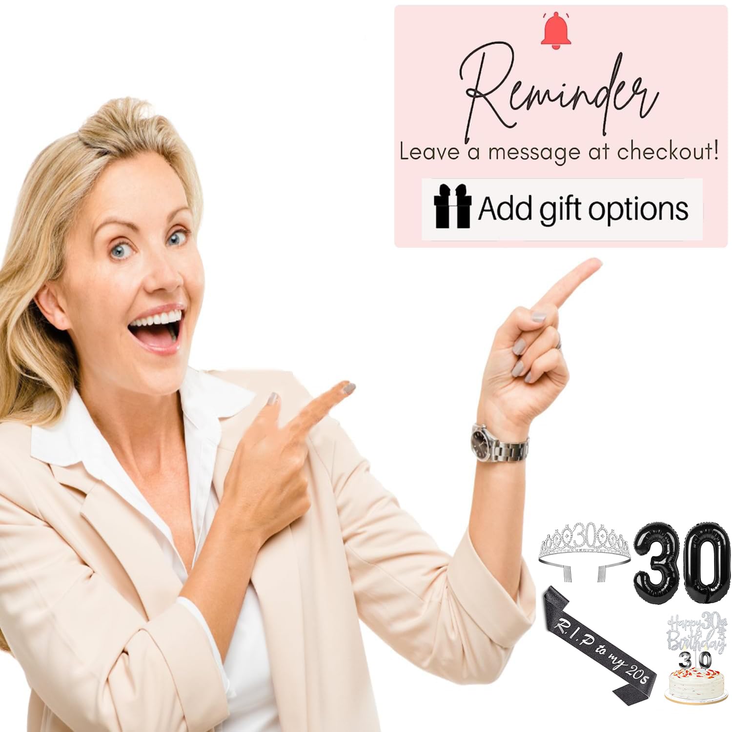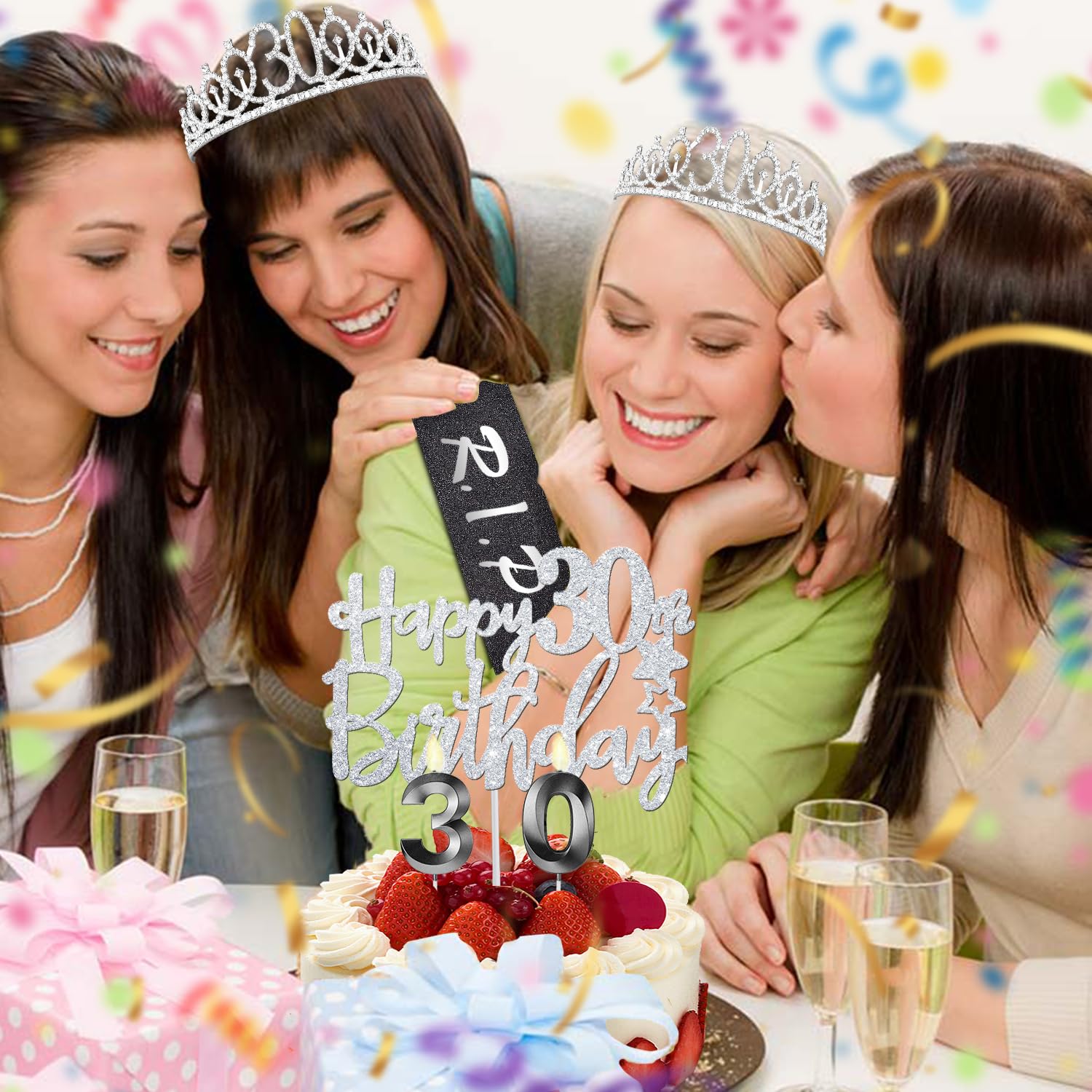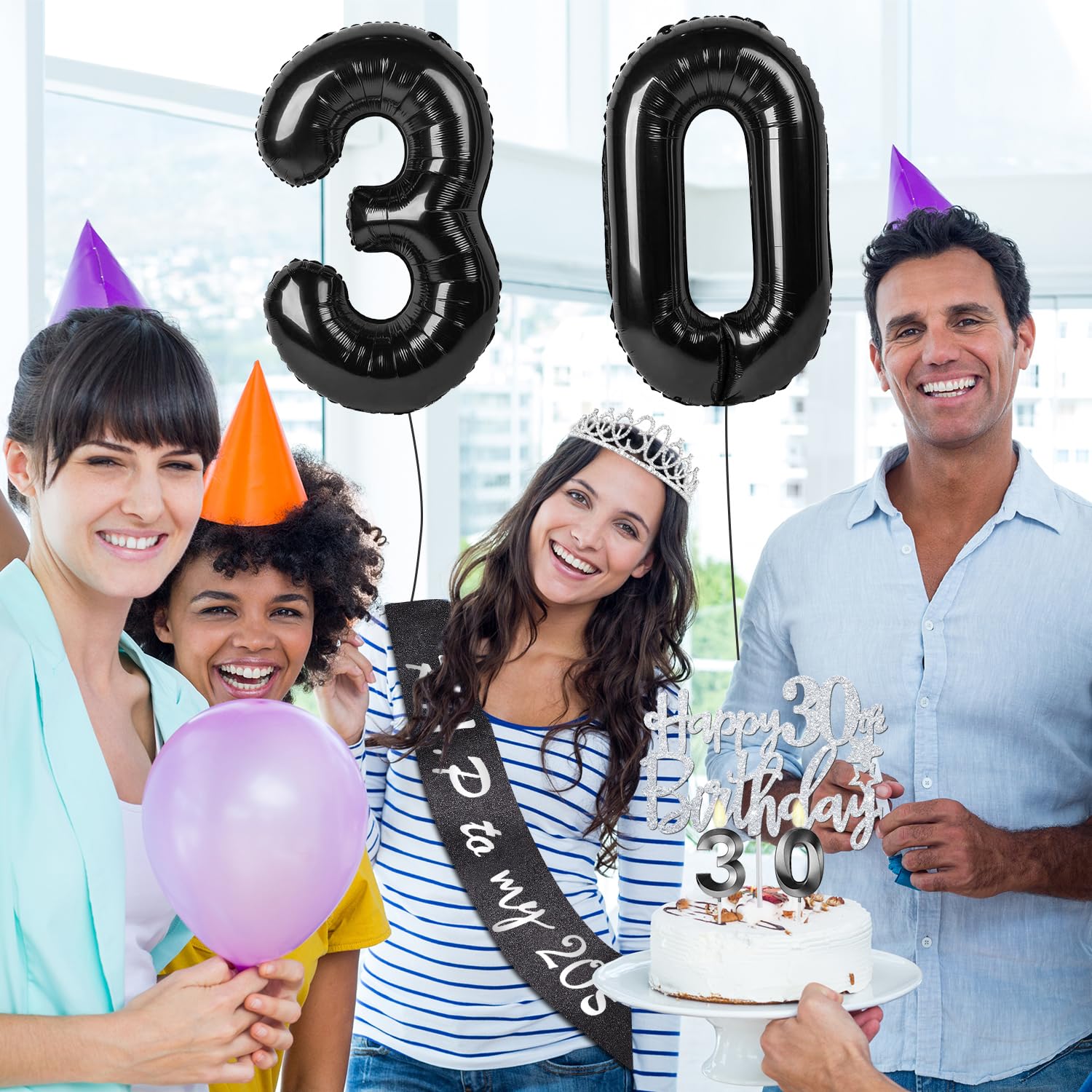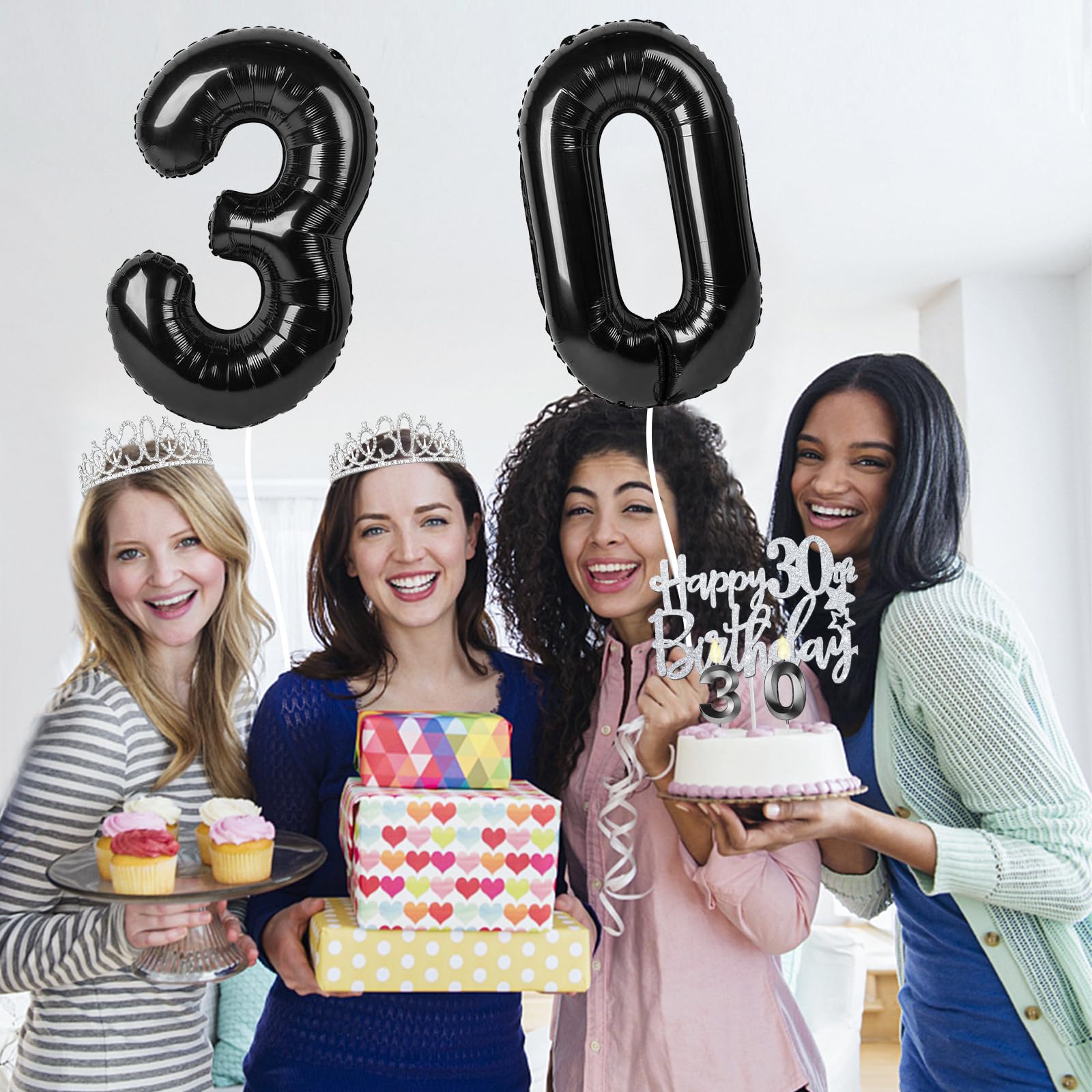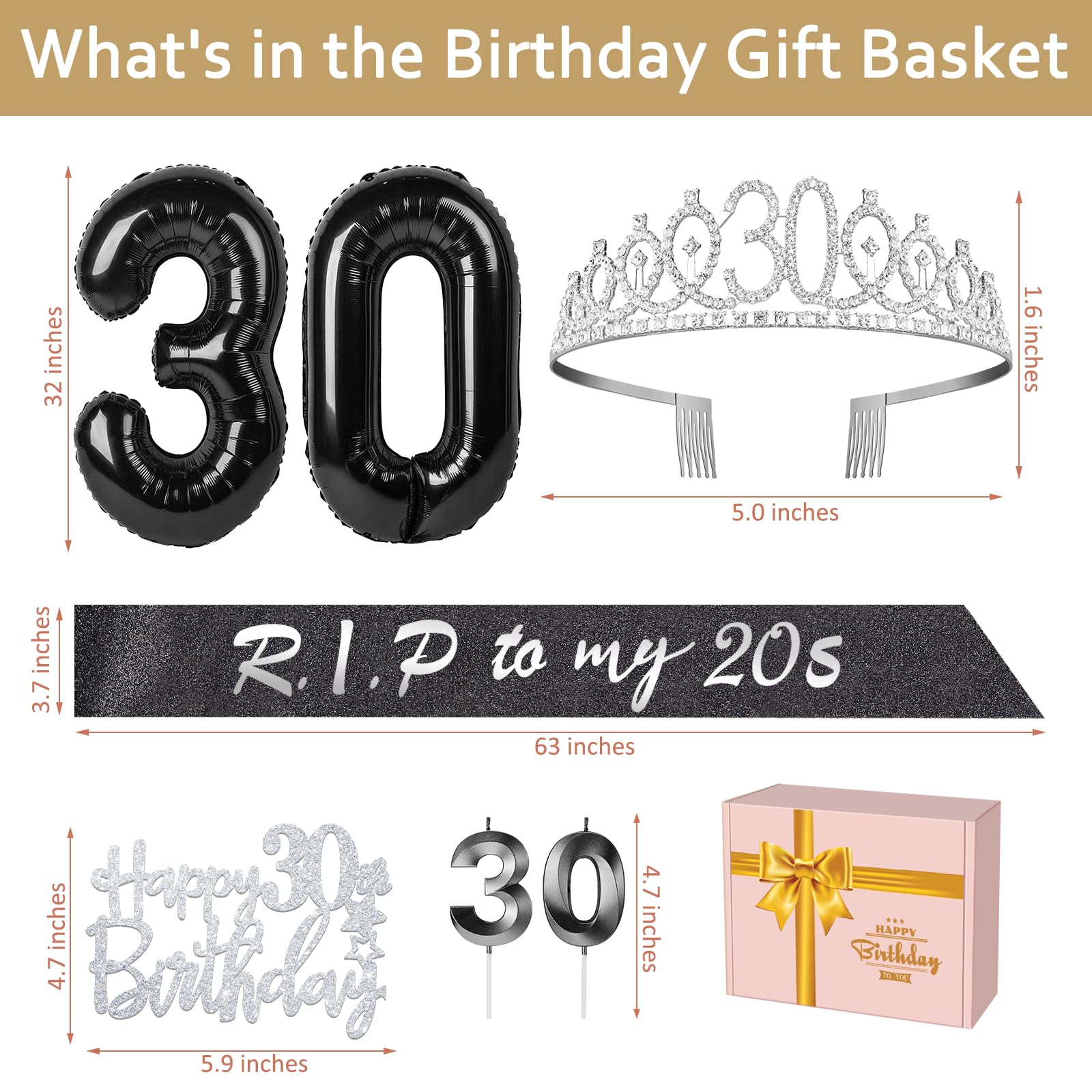 30th Birthday Decorations Set: Package Coming with Glittery Rhinestone Silver 30th Birthday Tiara/Crown x 1pc, Black 30th Birthday Sash x 1pc, Happy 30th Birthday Cake Topper x 1pc, Black 30 Birthday Candles x 1set, Big Black 30 Balloons x 1 set, Birthday Card x 1pc. This funny special death to my 30 birthday gift for women has been packed in a beautiful gift box for ready presentation