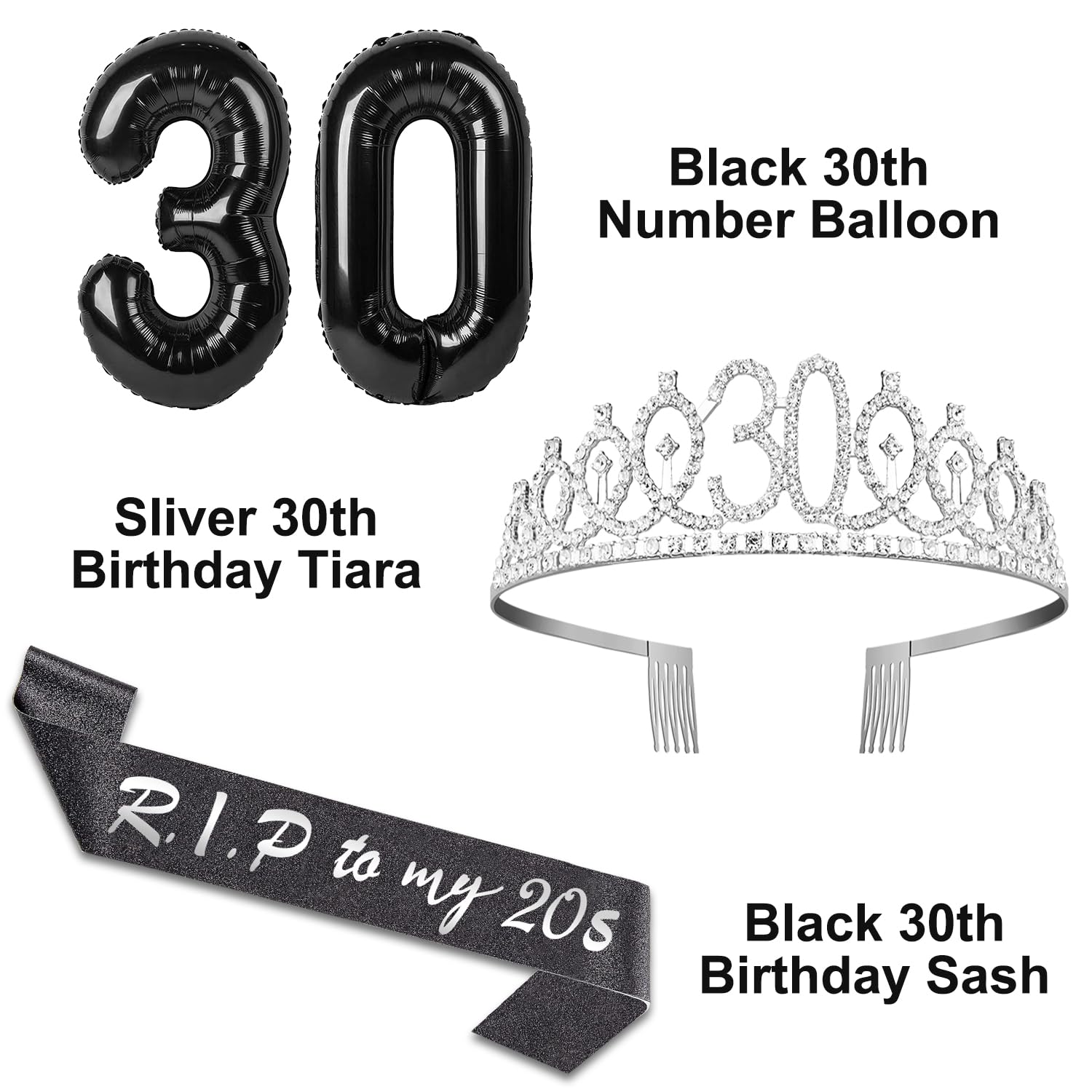 Silver 30 Tiara and Black 30th Birthday: Hand Made 30th birthday Crown is Made from silver alloy and rhinestone. Birthday Tiara is with Combs at the end of both side, which Make sure it can grip the hair more tightly and comfortable to fit most women and girls. Our Black RIP TO MY 20s Birthday Sash is made of balck glitter fabric with foil lettering. The sash is in 63 inch length and comes with a gold charm pin that you can easily adjust the length in your need