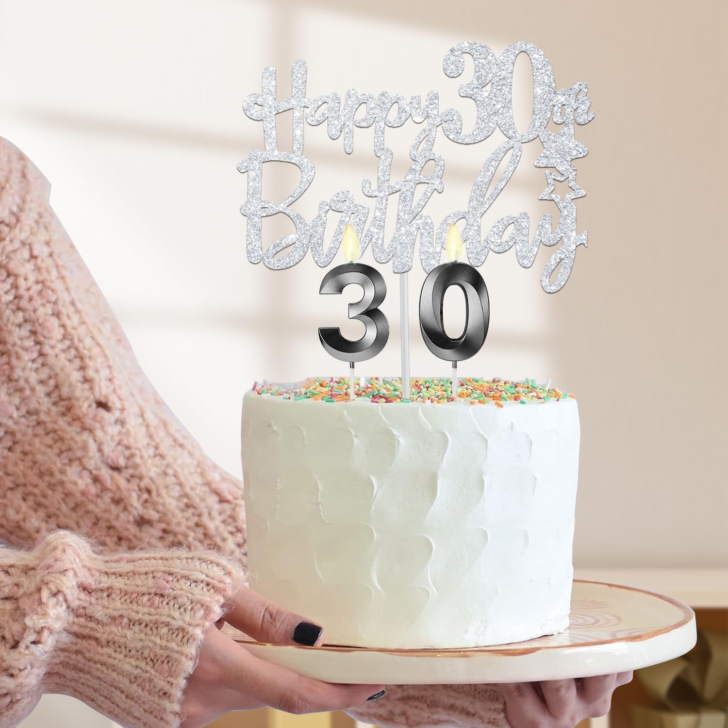 30th Birthday cake topper and 30 candles: Black 30th Birthday Candles in number 3 and 0, And 1Pcs Silver Glittery Happy 30th Birthday Cake Topper that are elegant prop to embellish your cake and cupcake. These dreamy 30th Birthday cake decor kit help to create a good dead to 20s birthday celebration. A classical birthday card included will good help to write your love word to the 30 year old woman