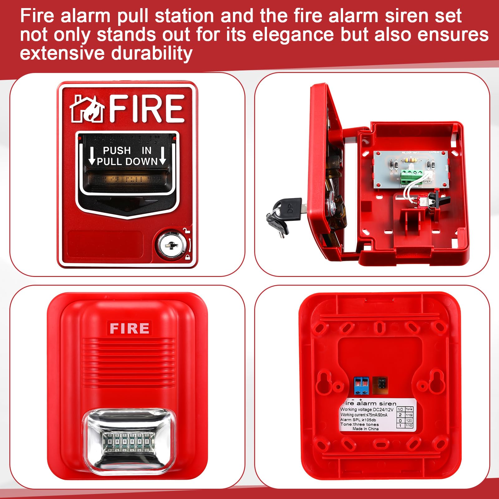 Features: Conventional alarm points: reliable and easy to use These manual alarm points are specifically designed for conventional fire alarm systems, enabling easy reporting of fires or emergencies through their push in/pull down handle locks. Enhanced alarm design: prompt danger perception Featuring LED lights and three distinctive alarm tones, the stations and sirens set combines sound and light alarms for a boosted alarm function. This design ensures quick perception of danger, enabling quick and efficient evacuation. Specifications: Material: plastic Color: red, black Dimensions: Emergency fire alarm station: about 5.51 x 4.13 x 1.77 inches Fire alarm siren: about 5.31 x 4.53 x 1.89 inches Power Source: Fire alarm siren: corded electric Emergency alarm station: 12V/24V DC Package includes: 4 x Emergency fire alarm station 8 x Key 4 x Fire alarm siren Notes: Manual measurement, please allow slight errors on size. The color may exist a slight difference due to different screen displays.