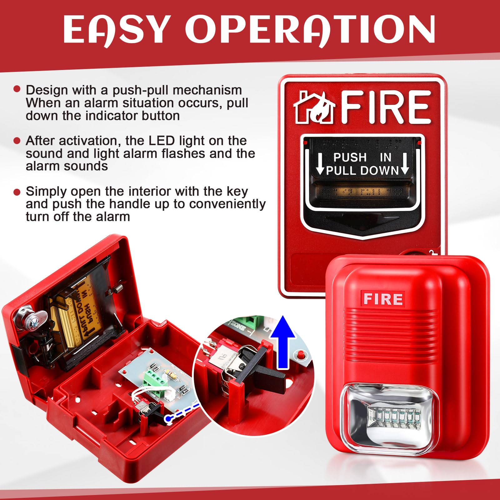 Uncomplicated Operation: designed with a press and pull mechanism, this fire alarm station is simple to operate, firm, and user friendly; Upon activation, the LED light on the sound and light alarm flashes while the alarm sounds, providing clear visibility and audible alert for emergencies; The alarm can be conveniently turned off just by pushing up the handle
