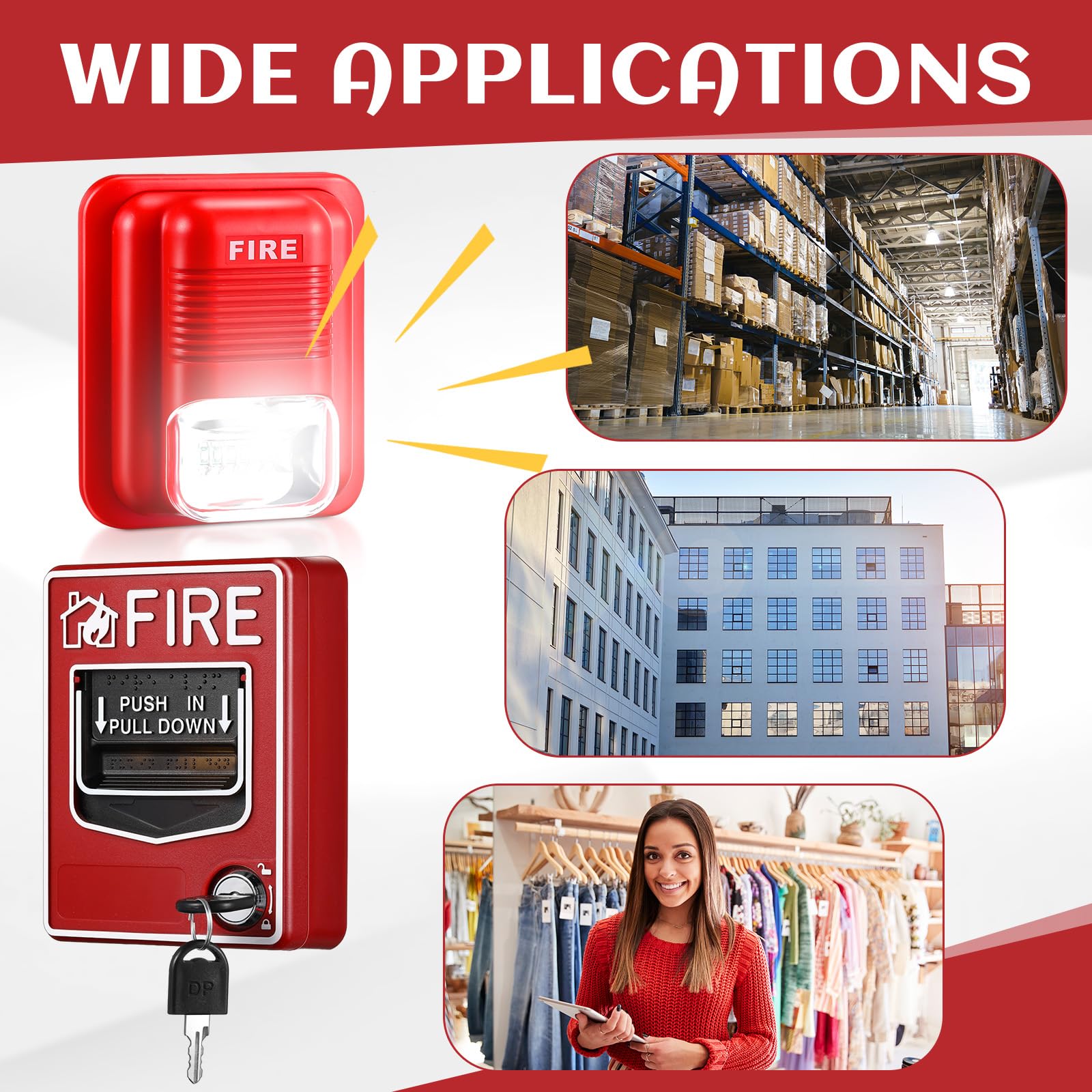 Broad Application: the set, containing 4 fire alarm stations and 4 fire alarm sirens, is suitable for various settings, from homes to shopping malls; This wired emergency fire station set is a reliable protector against fire emergencies, offering durability, ease of use, and instant alarm prompts for quick evacuation