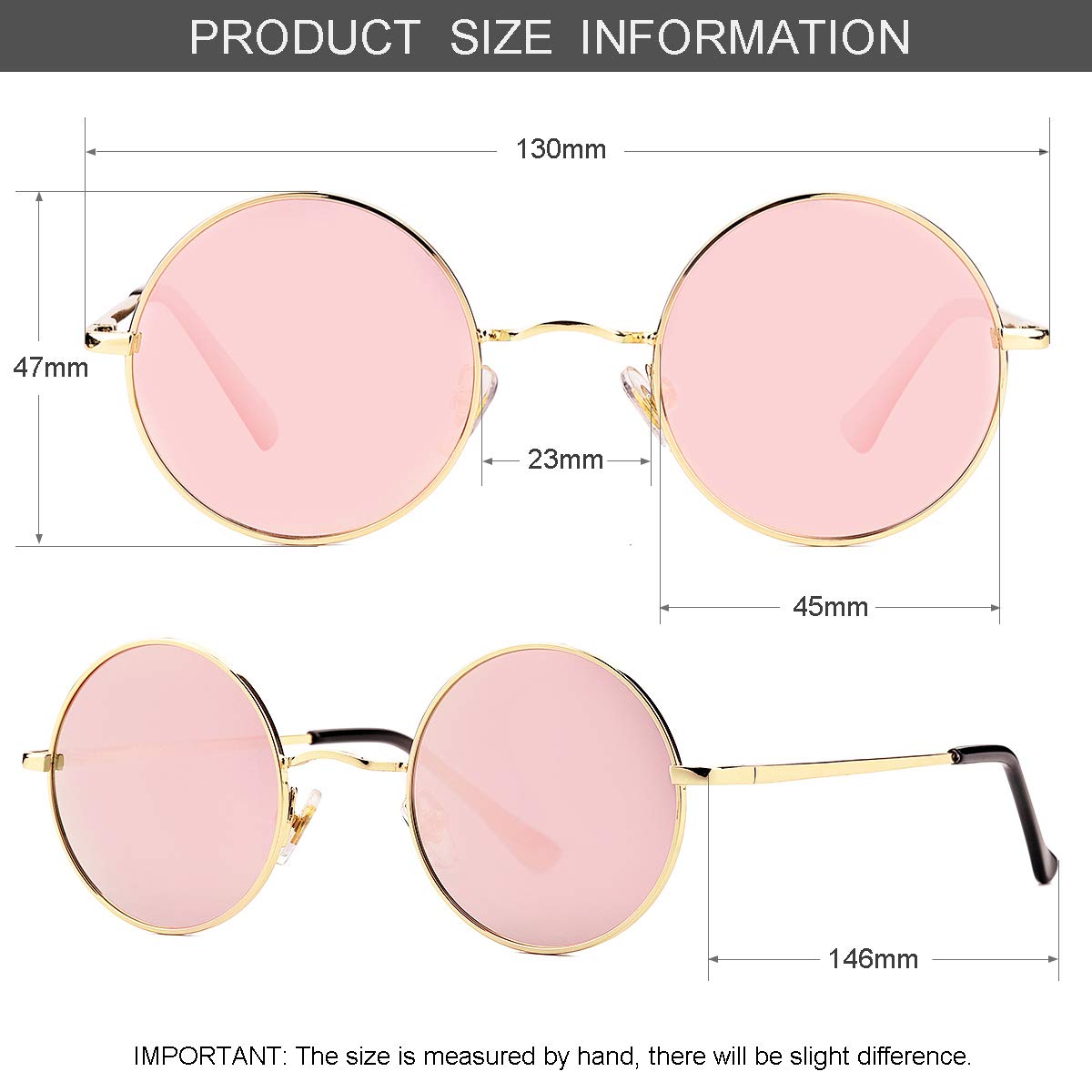 ★ PRODUCT DIMENSION - Lens Width: 45mm (1.77 IN), Frame Height: 47mm (1.85 IN), Nose Bridge: 23mm (0.9 IN), Frame Width: 130mm (5.12 IN), Temple Length: 146mm (5.75 IN). Net Weight: 20g.