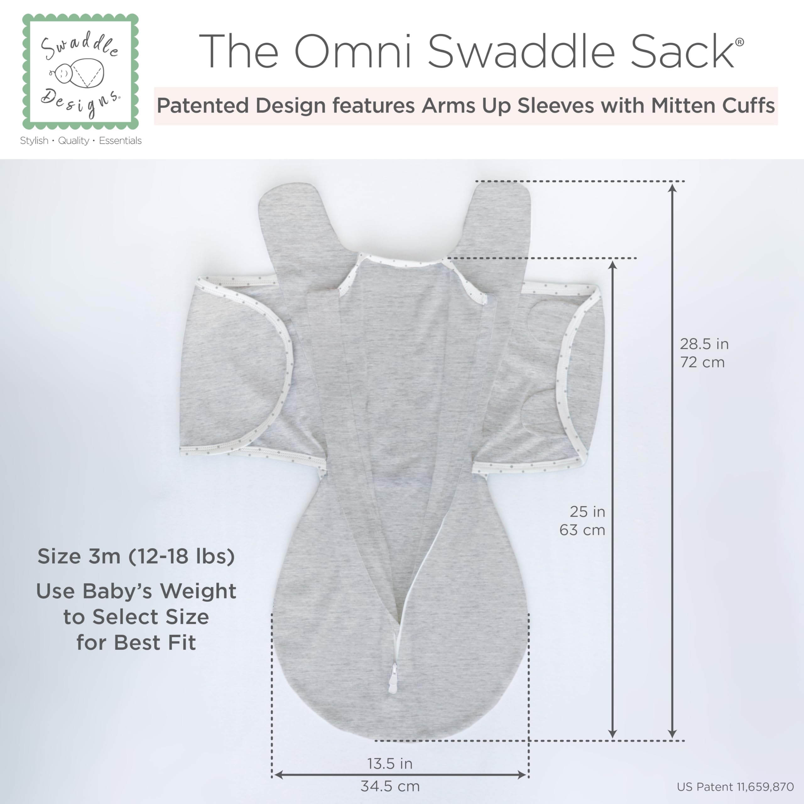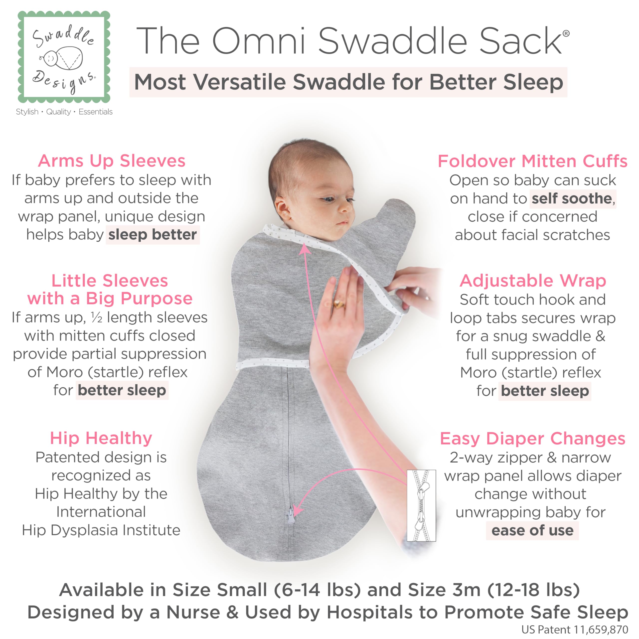 Description The 6-way Omni Swaddle Sack with Adjustable Wrap and uniquely shaped 1/2 length sleeves with mitten cuffs is the ideal swaddle designed by a nurse. The ergonomic and convertible design supports more natural hand and arm positions, and provides parents with more options when preparing baby for safe sleep. The design allows parents to swaddle with (1) arms on chest under the wrap (2) one or both hands up, and (3) both arms up and out from under the wrap. The sleeves with mitten cuffs keep baby's arms warm. Foldover mitten cuffs may be worn open or closed, parents can open the cuffs, so baby can self-soothe by sucking on hands or close the cuffs to protect baby from facial scratches. Many experts recommend parents to swaddle baby with hands within reach of mouth, so baby can self-soothe. Babies who can self-soothe sleep longer and better. When baby is swaddled with hands up or arms up, baby can self-soothe by sucking on hands. The ergonomic, patented design with 2-way zipper is easy to use. The adjustable wrap is narrow and does not interfere with baby's hips and the soft hook-and-loop fasteners make it easy to swaddle baby. The 2-way zipper allows parents to unzip from the foot to check baby's diaper without unwrapping the swaddle. The 2-way zipper makes it easy to place baby in the sack by unzipping from the top. Size Small 6-14 lbs, 0-3m. Size 3m 12-18 lbs for bigger baby. When baby shows signs of attempting to rollover, the AAP recommends that parents stop restraining baby's arms with a swaddle or wrap. Parents can use the Omni as a transition swaddle with arms up and wrap secured around tummy and chest. When baby outgrows the Omni Swaddle Sack, we recommend a SwaddleDesigns Transitional Swaddle Sack® or a zzZipMe Sleeping Sack wearable blanket. Super soft, premium cotton knit is breathable, stretchy, and natural. 100% Cotton. Machine wash. Tumble dry. US Patents 11,659,870 & D924,539. Int’l patents EU, UK, Canada and others online