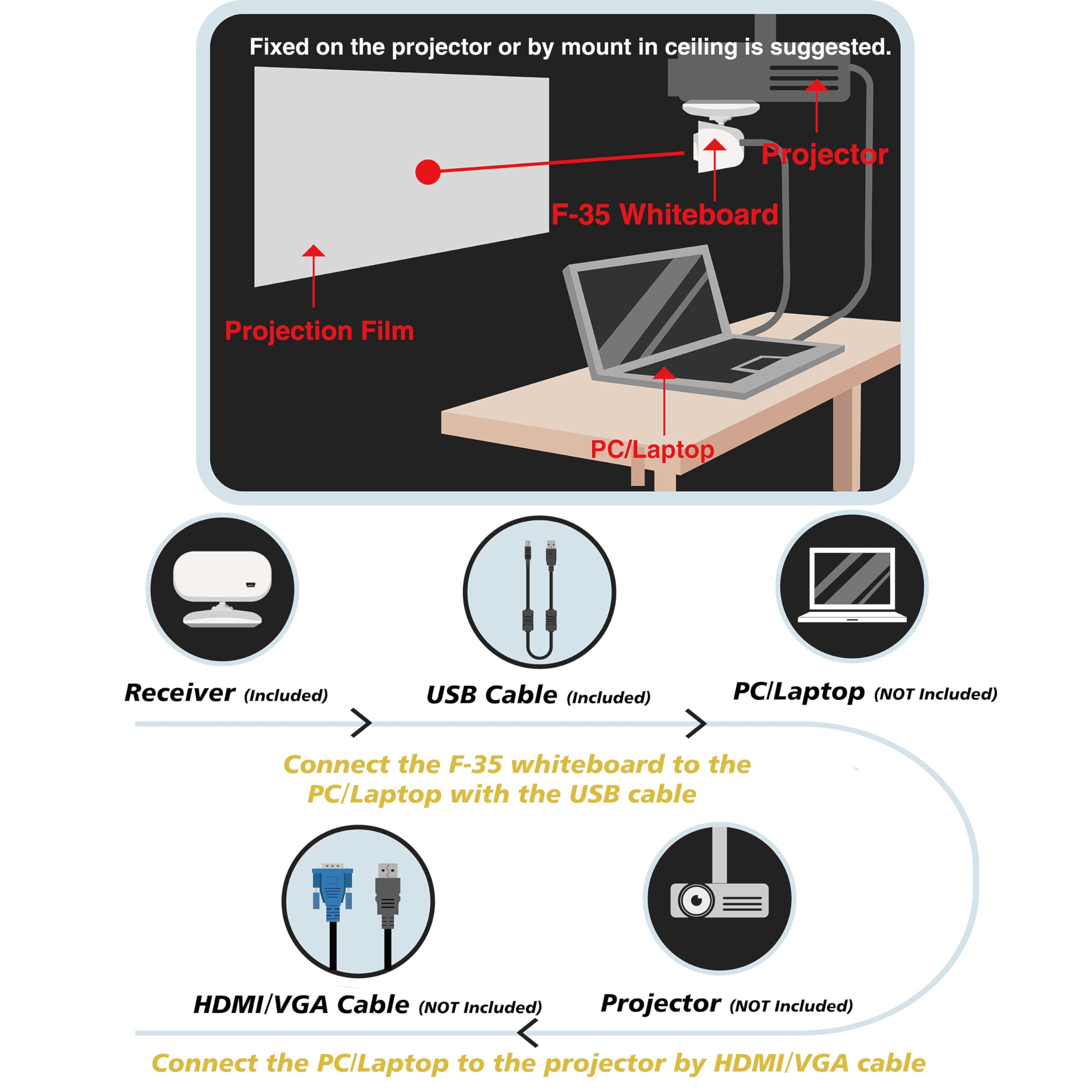 [Wide Compatibility] This interactive whiteboard is compatible with Windows XP, Win7, Win 8, Win 10 and Win 11 operating systems. It connects easily to your computer via USB and to a projector via HDMI/VGA, allowing you to turn almost any projection surface (such as walls or screens) into an interactive whiteboard.