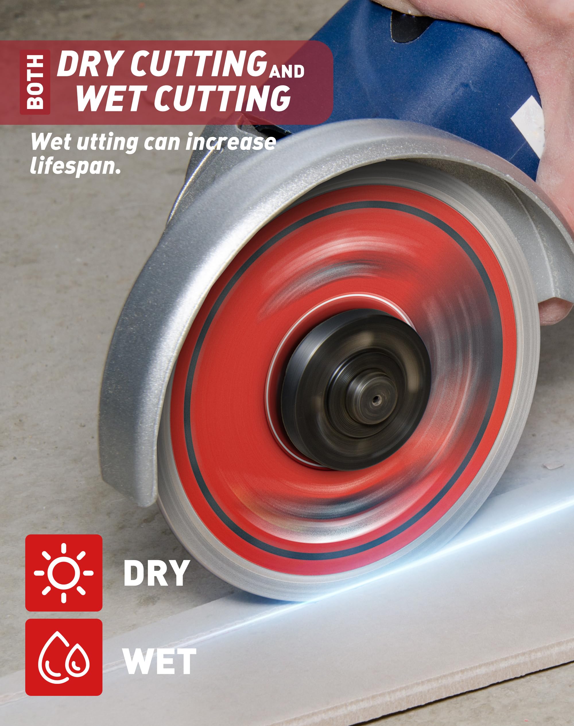 【Reduced Cutting Force】Super thin design requires less force during cutting, preventing tile breakage and reducing wear on the cutting tool. These diamond cutting discs are suitable for both dry and wet cutting but wet cutting can significantly increase life of the blade