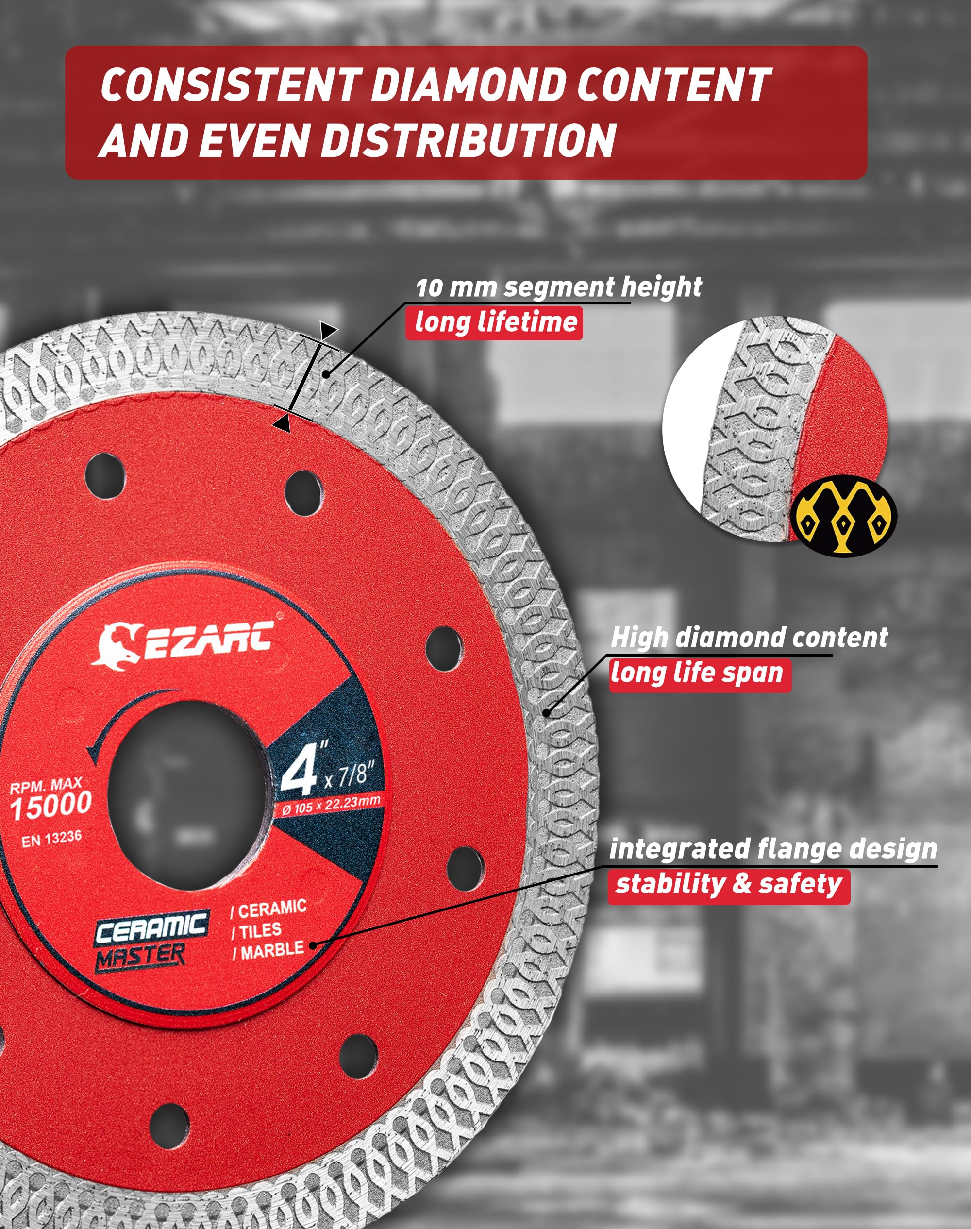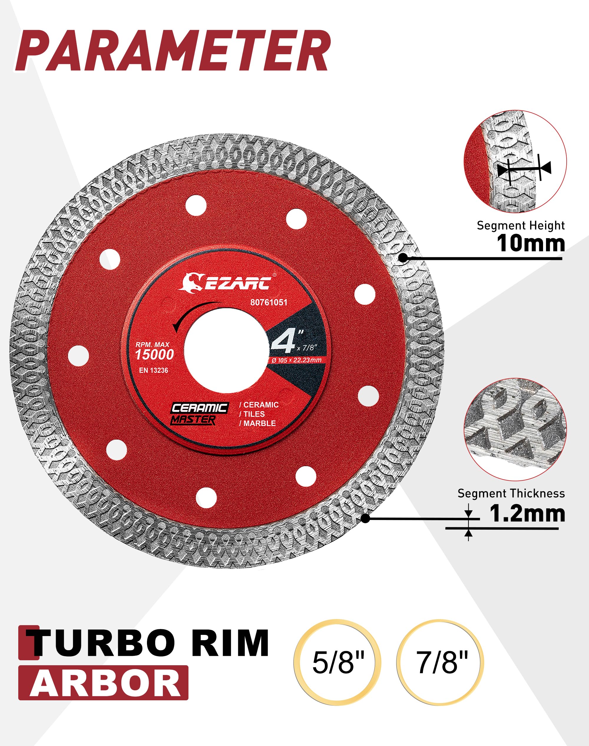 【Compatibility】EZARC 4 inch diamond cutting wheel is suitable for most tile saws, hand-held angle grinders and wet saws with a 7/8" Arbor (includes a adaptor for 5/8" arbor). Disc Size: 4 Inch; Segment Height: 10mm; Segment Thickness:1.2mm; Maximum: 15,000 RPM